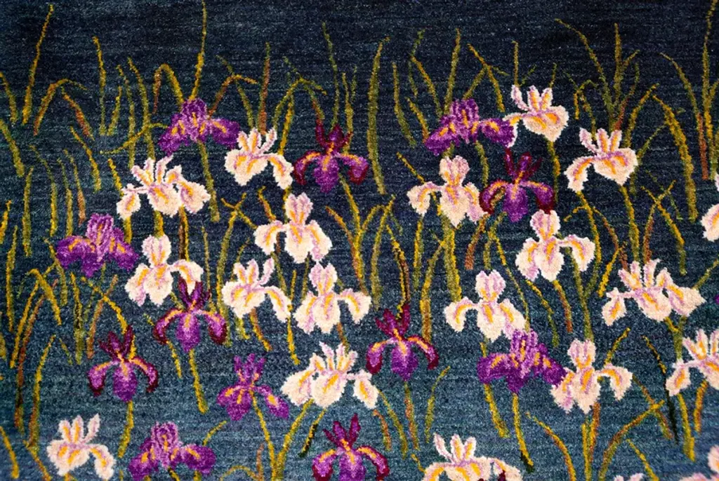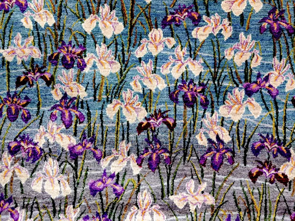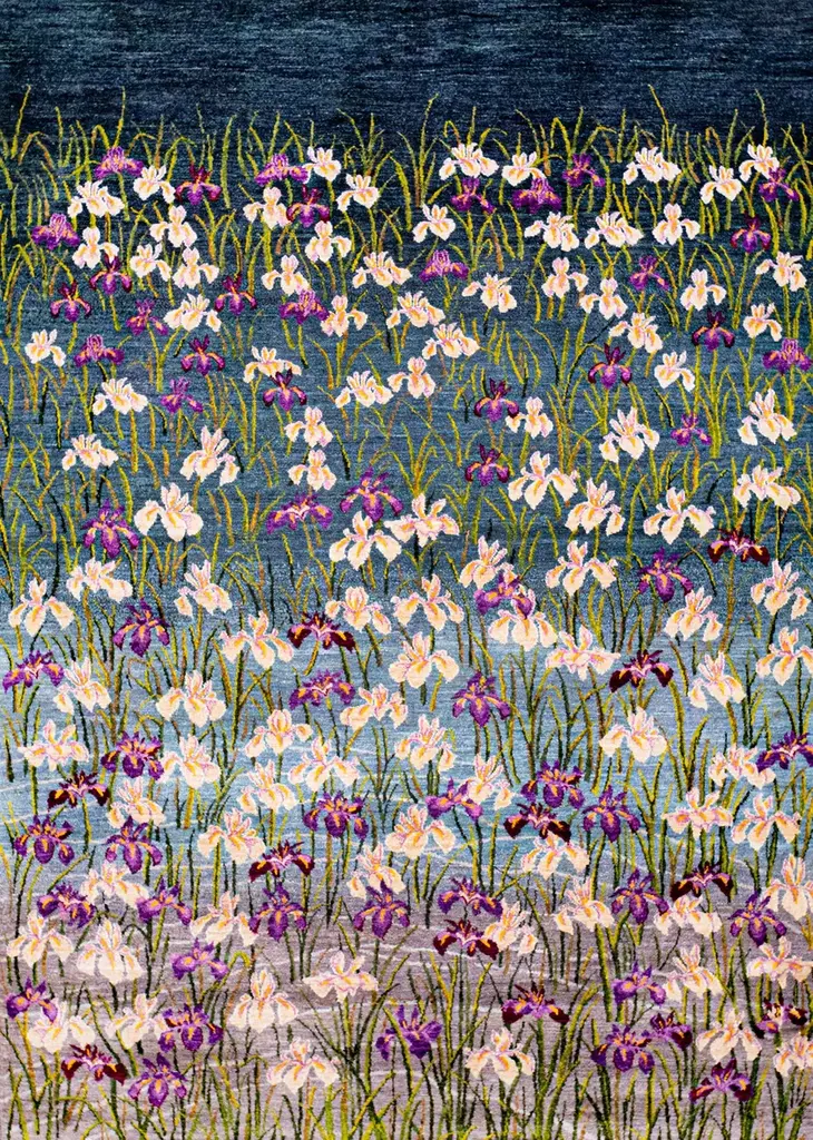 Flower Meadow 6 is a rectangular wool rug.Zollanvari Super Fine.Bursting with the joys of summer meadows filled with dancing daisies the original design of this Gabbeh is naturalistic and surreal at the same time. The designer/weaver have cleverly transported us to a field of dreams... Never-never Land perhaps? The juxtaposition of the bright and contrasting colours of the flowers on the delicately abrashed woollen ground creates a sense of natural movement in this design, as if a gentle breeze is blowing through this magical meadow that stretches out to the horizon... an amazing sense of perspective that takes one's breath away.
