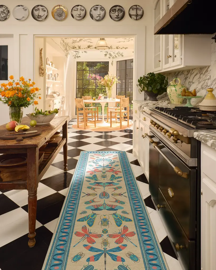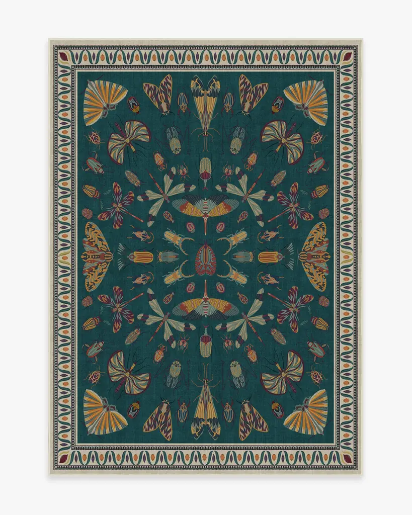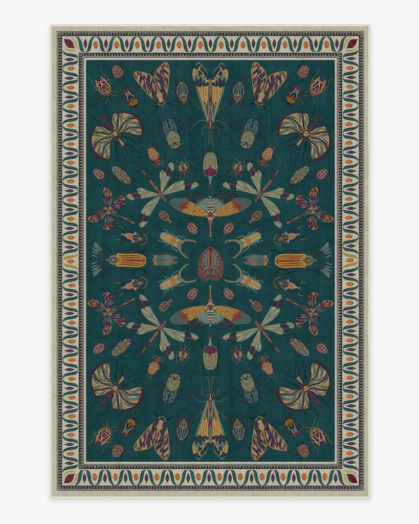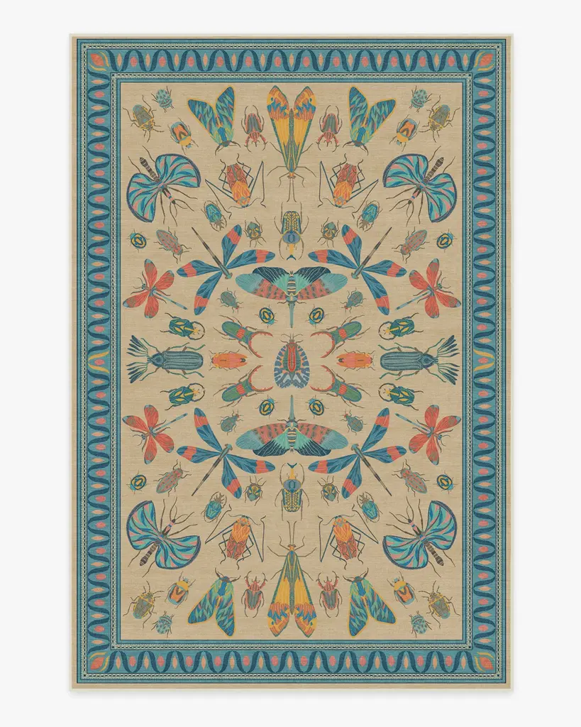 It's a bug's life. Our Iris Apfel Flutterby Multicolor Rug showcases a diverse mix of extravagant insects in candy pink, coral, and shades of blue. Brightly colored in a spring palette, this intricate design is inspired by the fashion icon's unique and bold sense of style. Look for fluttering butterflies near the zigzag aqua border, all complemented by a gentle nude background. Water-resistant, stain-resistant, and machine-washable. Rug colors may vary slightly according to your device and the lighting in your space.