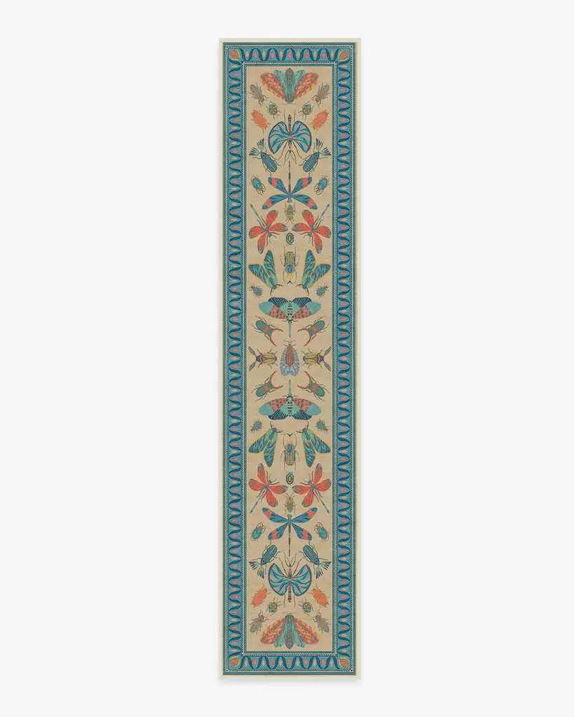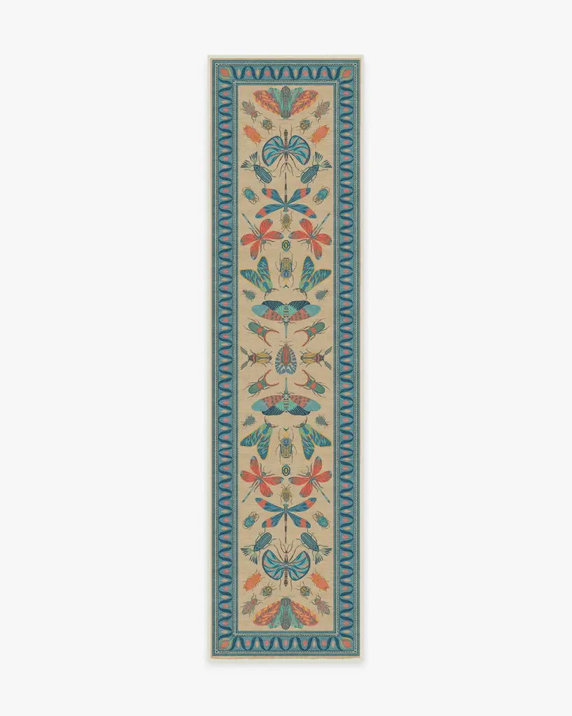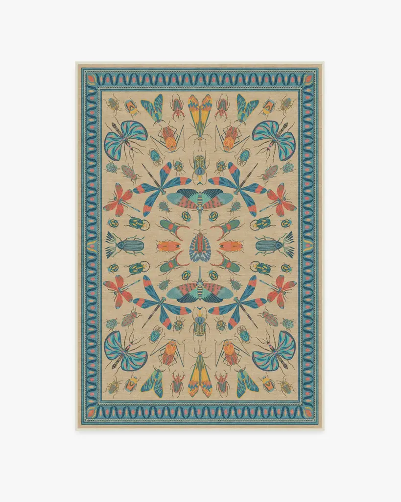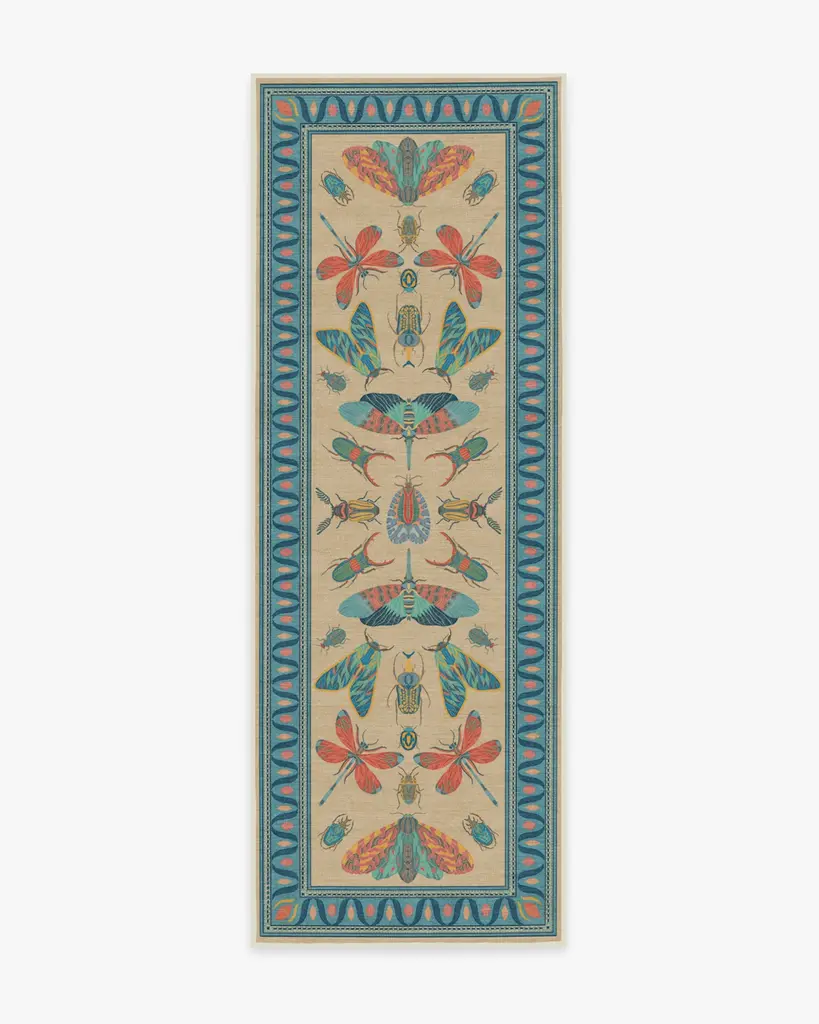 It's a bug's life. Our Iris Apfel Flutterby Multicolor Rug showcases a diverse mix of extravagant insects in candy pink, coral, and shades of blue. Brightly colored in a spring palette, this intricate design is inspired by the fashion icon's unique and bold sense of style. Look for fluttering butterflies near the zigzag aqua border, all complemented by a gentle nude background. Water-resistant, stain-resistant, and machine-washable. Rug colors may vary slightly according to your device and the lighting in your space.