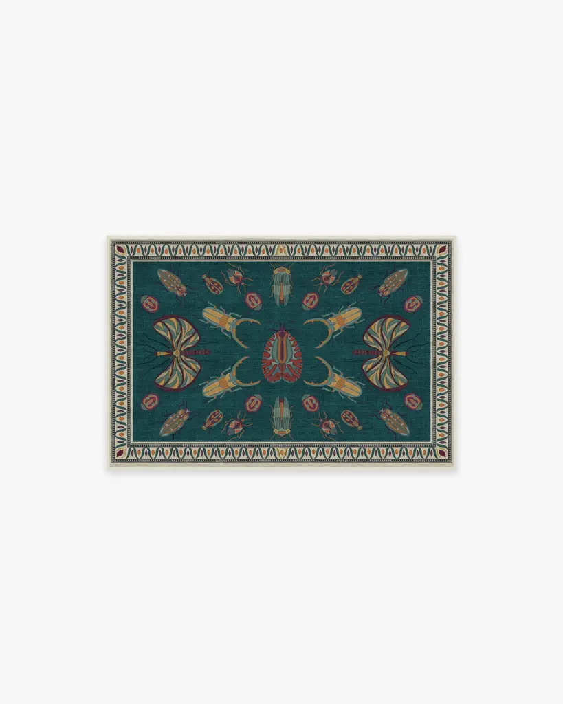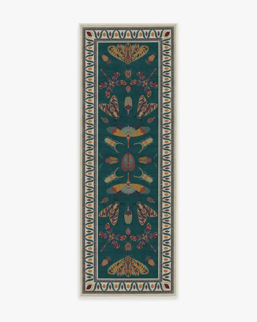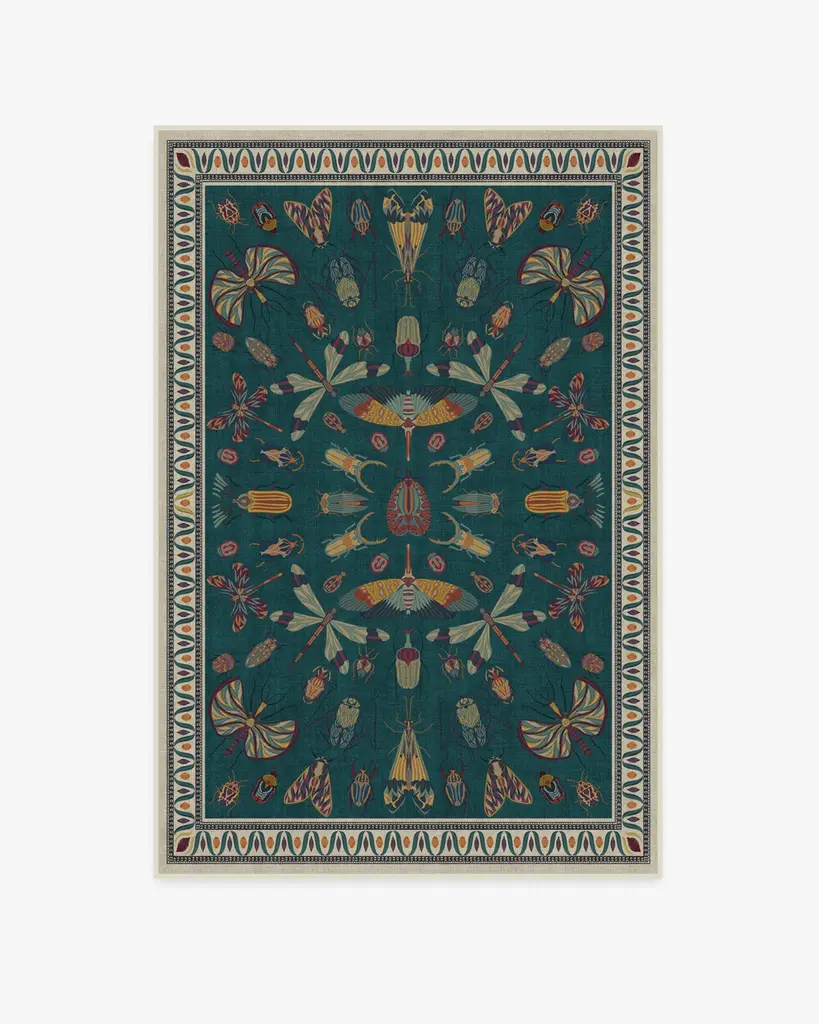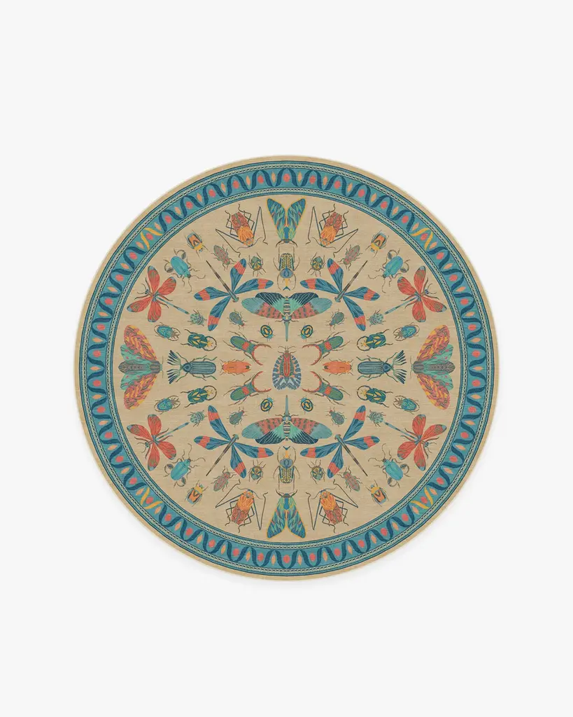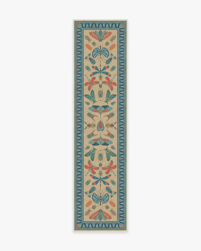 It's a bug's life. Our Iris Apfel Flutterby Multicolor Rug showcases a diverse mix of extravagant insects in candy pink, coral, and shades of blue. Brightly colored in a spring palette, this intricate design is inspired by the fashion icon's unique and bold sense of style. Look for fluttering butterflies near the zigzag aqua border, all complemented by a gentle nude background. Water-resistant, stain-resistant, and machine-washable. Rug colors may vary slightly according to your device and the lighting in your space.