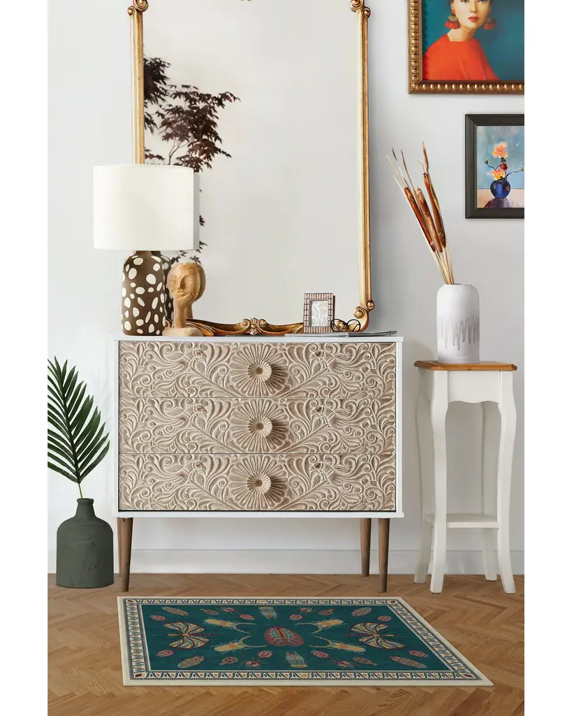 It's a bug's life. Our Iris Apfel Flutterby Rug showcases a diverse mix of extravagant insects. Rich with a jewel-tone colorway on a teal background, this intricate design is inspired by the fashion icon's unique and bold sense of style. Water-resistant, stain-resistant, and machine-washable.