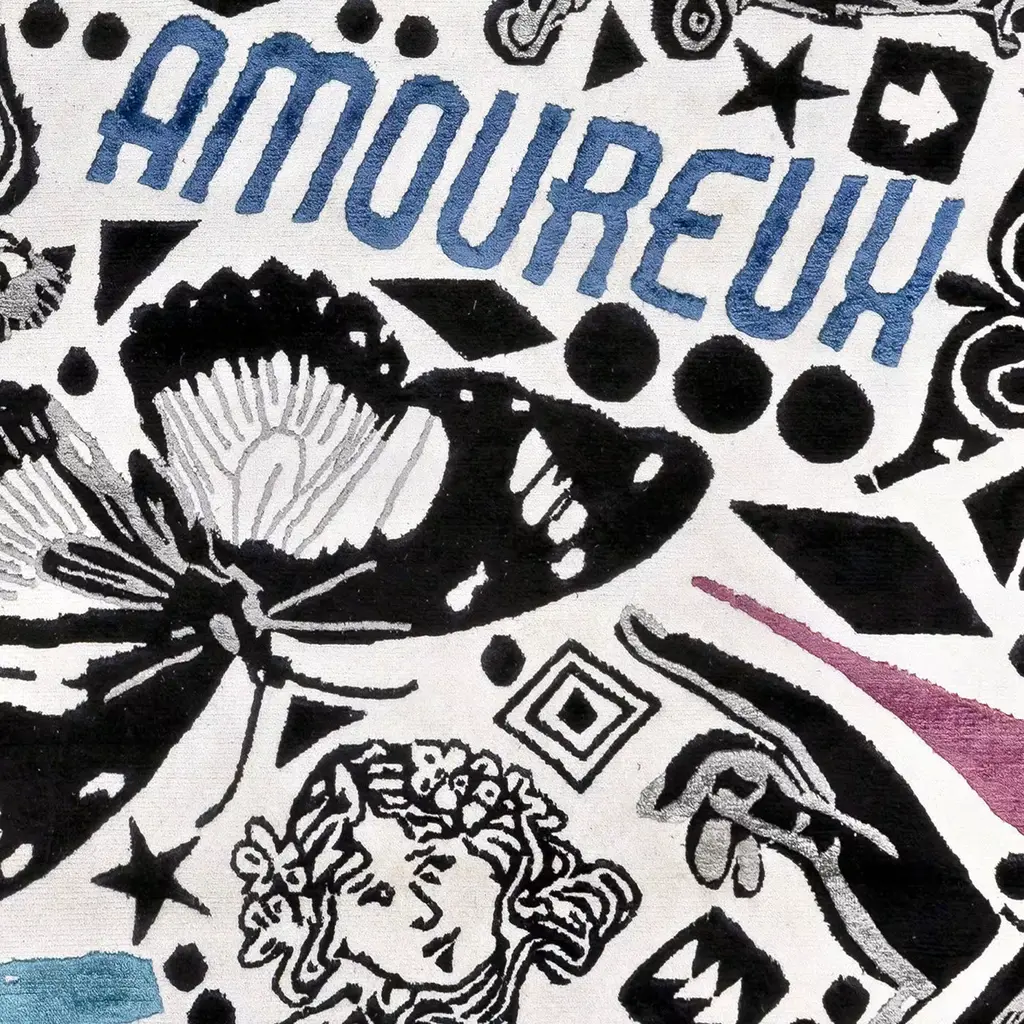 A tribute to the iconic illustrations and symbols from the 20th century, this precious rug will impeccably complement vintage-inspired decors. An equal percentage of silk and Himalayan wool are weft together by Nepalese master craftsmen to obtain its hypnotizing, sunburst design (H .07cm) rich in color conflicts and eloquent letterings. This 152,000 knot/sqm piece is completed by a .05cm-high base. Anti-stain treatment and other customizations are available, please ask the Concierge.