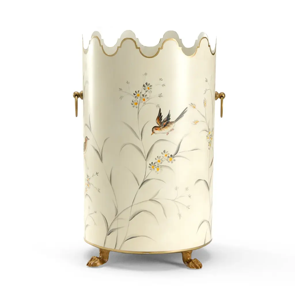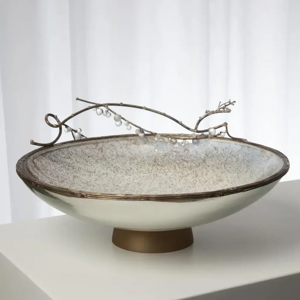 The glass on the Forest collection has a unique finish as a result of a chemical reaction. It has a mercury glass interior that fades in to the snow white textured finish . The base of the pieces is matte antique brass and the rim is adorned with glass garland beads. Decorative use only. From a fashion forward perspective, Global Views offers accessories, furniture, statement lighting, and an assortment of rugs and mirrors to add beauty and joy to your home.