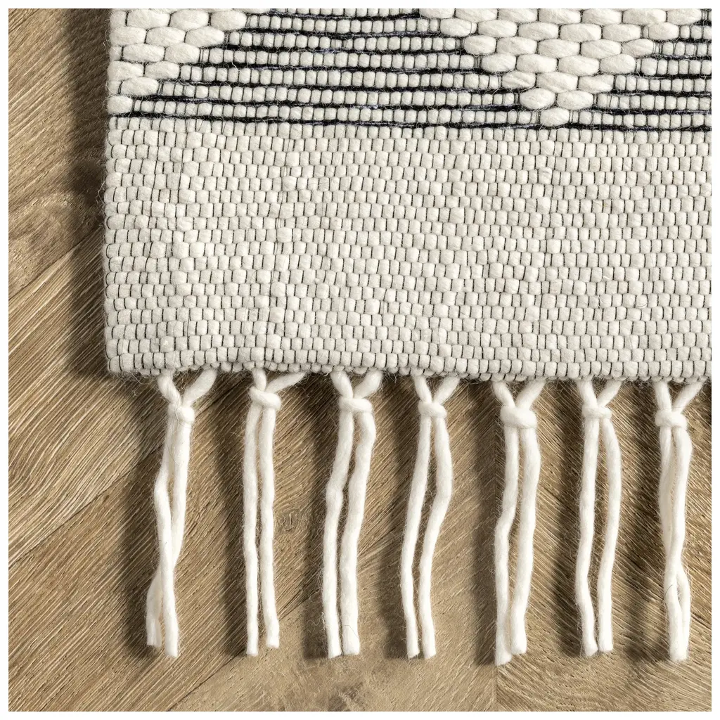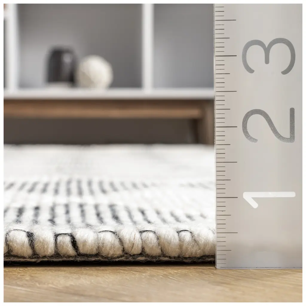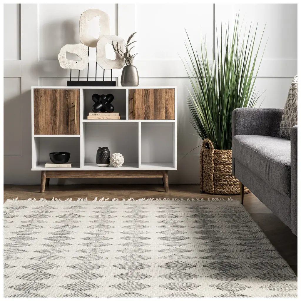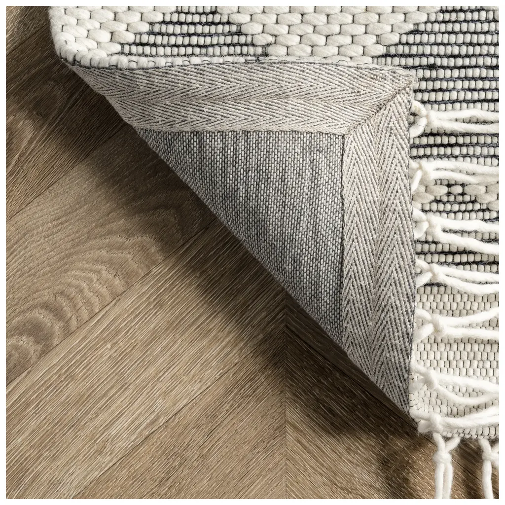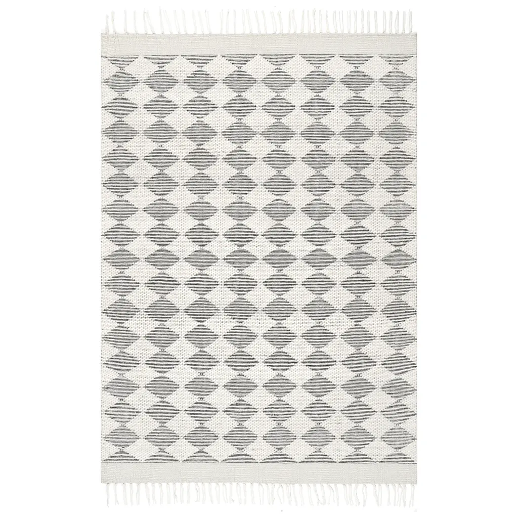 It has diamonds. It has tassels. It has texture. The Fractal Rug has everything, and it's calling your name. It's both on trend and totally timeless. The way the colors contrast and the wool-blend fibers feel underfoot give it an elevated touch you'll love. Designed to add an element of cozy, it's the perfect way to ground a room in comfort.72% Wool, 28% Nylon, made in IndiaAdd warmth to your living room, bedroom, dining room, kitchen, or entryway with just the right amount of style, durability, and comfort with this wool rugA sleek and functional .25" pile height for convenient placement underneath furniture and entrywaysShedding is common in wool rugs, in addition to regular surface vacuuming, clean the floor under the rug. Spill or stains can be cleaned by gently blotting with a clean white clothWe recommend using a rug pad to provide extra cushioning and to prevent any possible slipping and sliding on your flooring. Rug pads serve as protective layering piece for your floor and your rug from any wear and tear, extending the life of your rug.