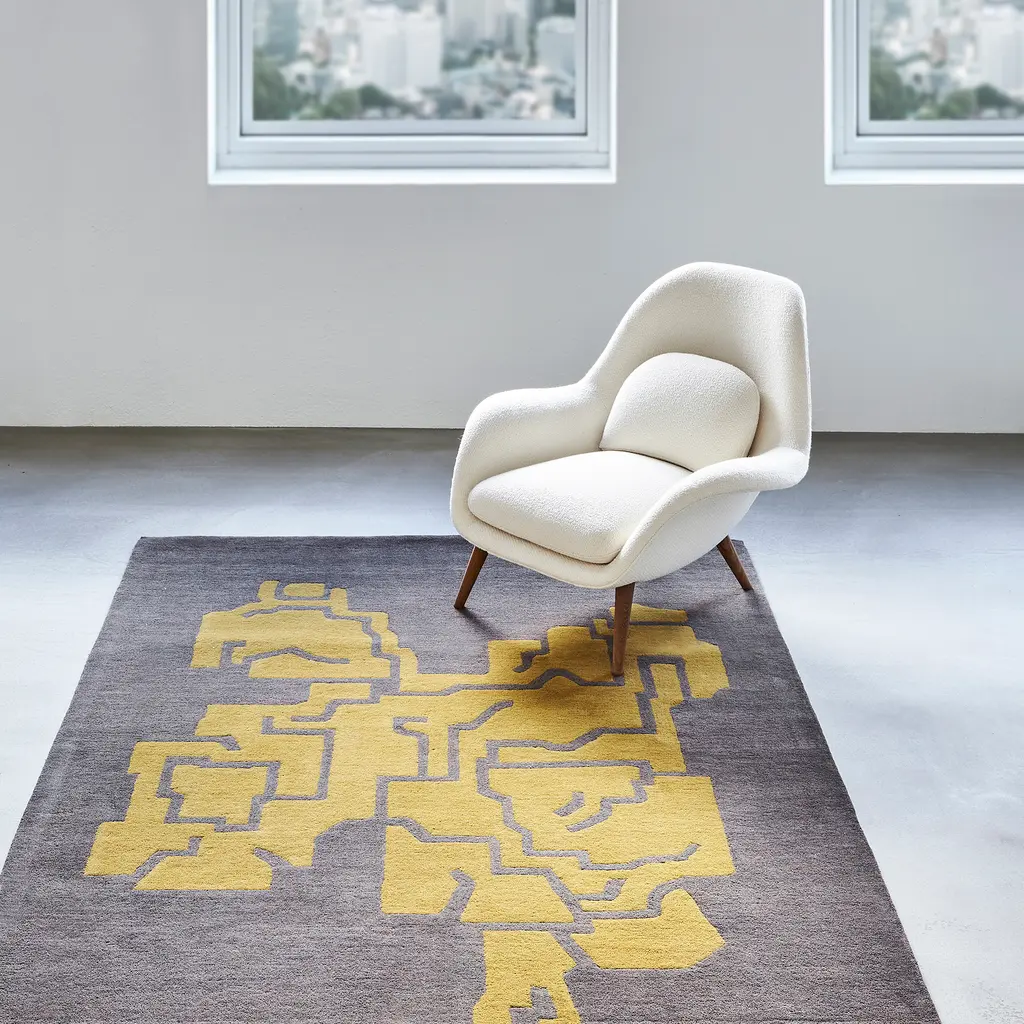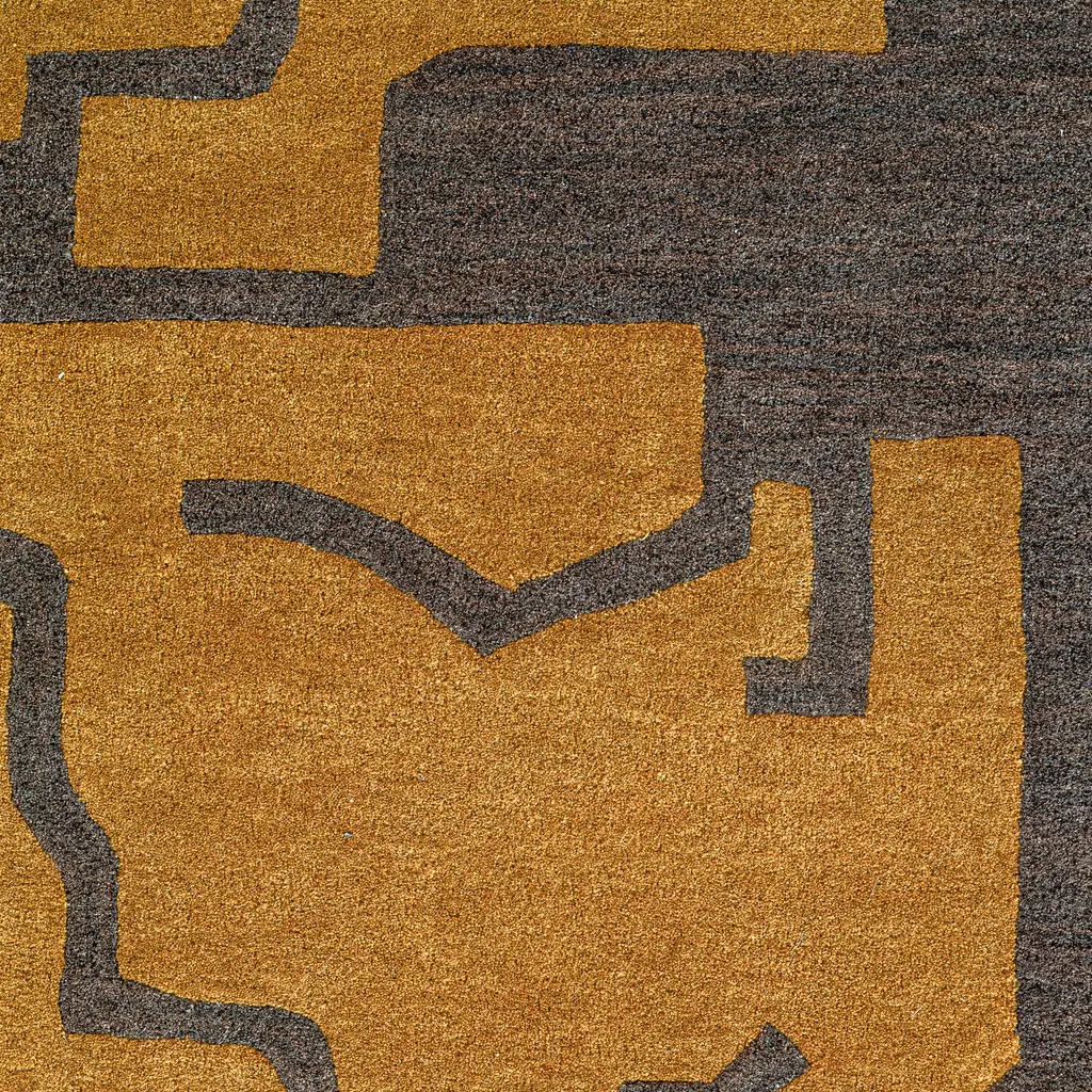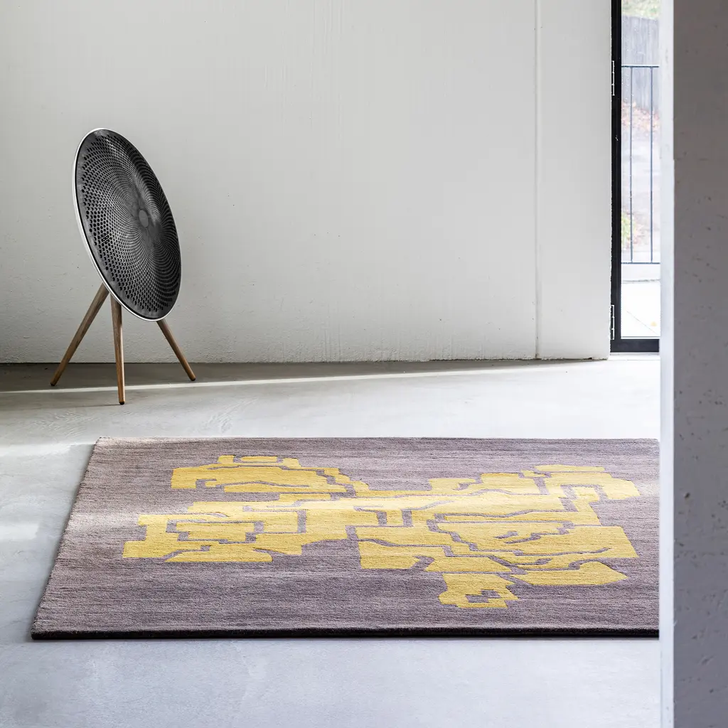 The Fragment I Rug is a bold statement piece, turning raw geometry into a textured landscape. Designed by OEO Studio for Massimo Copenhagen, it plays with contrast—sharp golden forms cut through a deep, smoky background, creating a striking visual rhythm. The abstract pattern feels both structured and organic, giving the rug a presence that commands attention without overwhelming the space. Hand-knotted from high-quality wool, it offers a dense, comfortable surface with a subtle variation in pile height, adding dimension to the design. The precise carving of each shape enhances the depth, making the pattern feel almost architectural. Whether in a living room, office, or gallery-style setting, Fragment I delivers a strong visual impact with a tactile quality that makes it as inviting as it is distinctive.