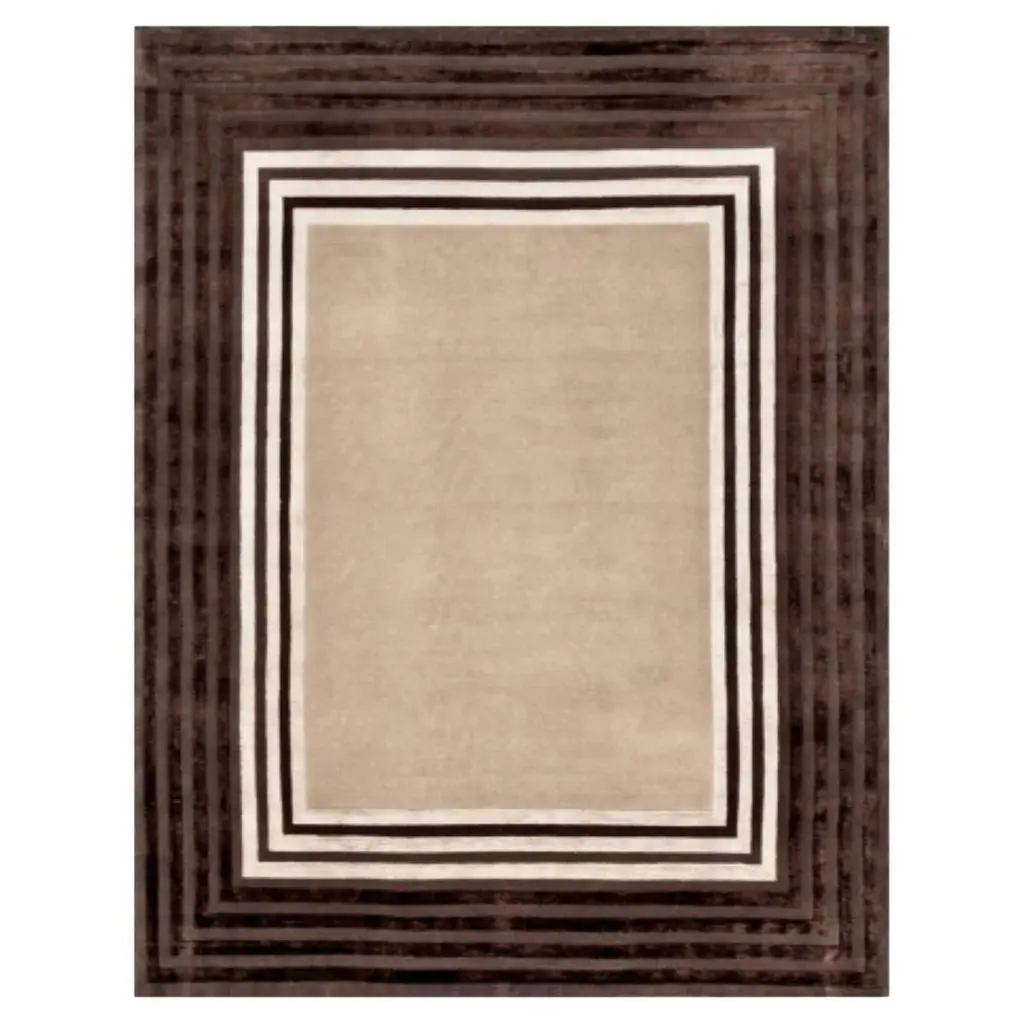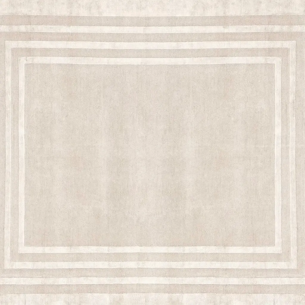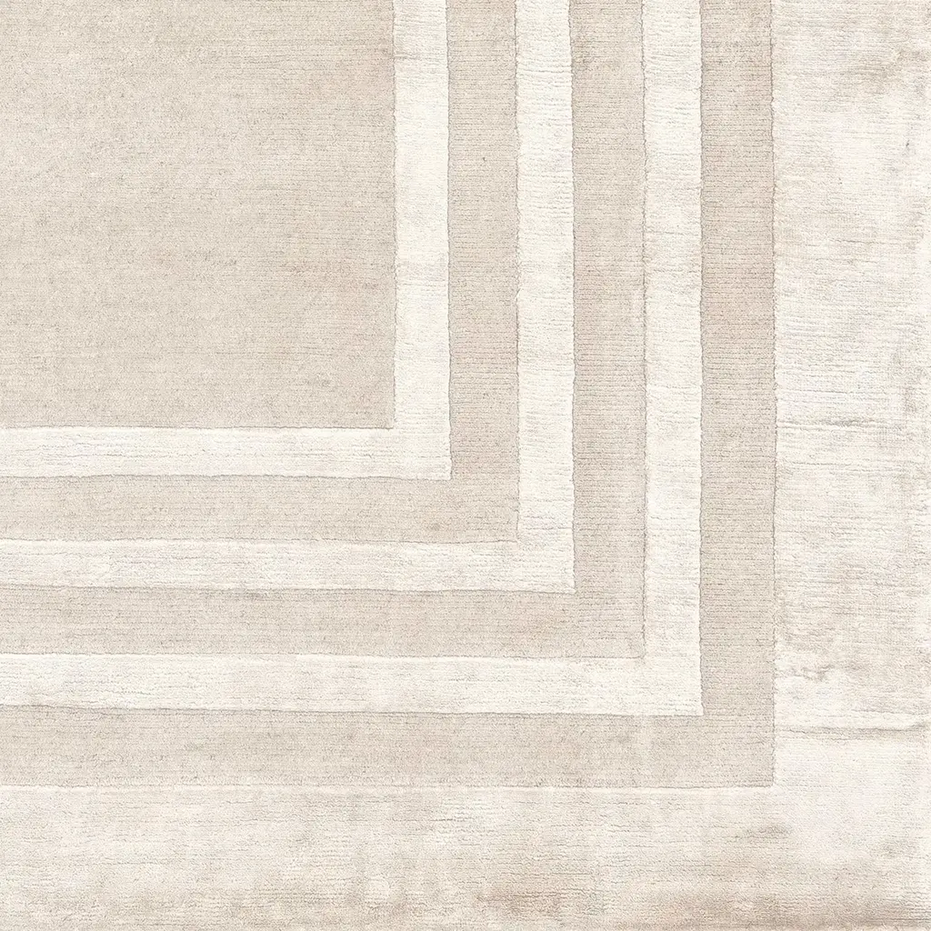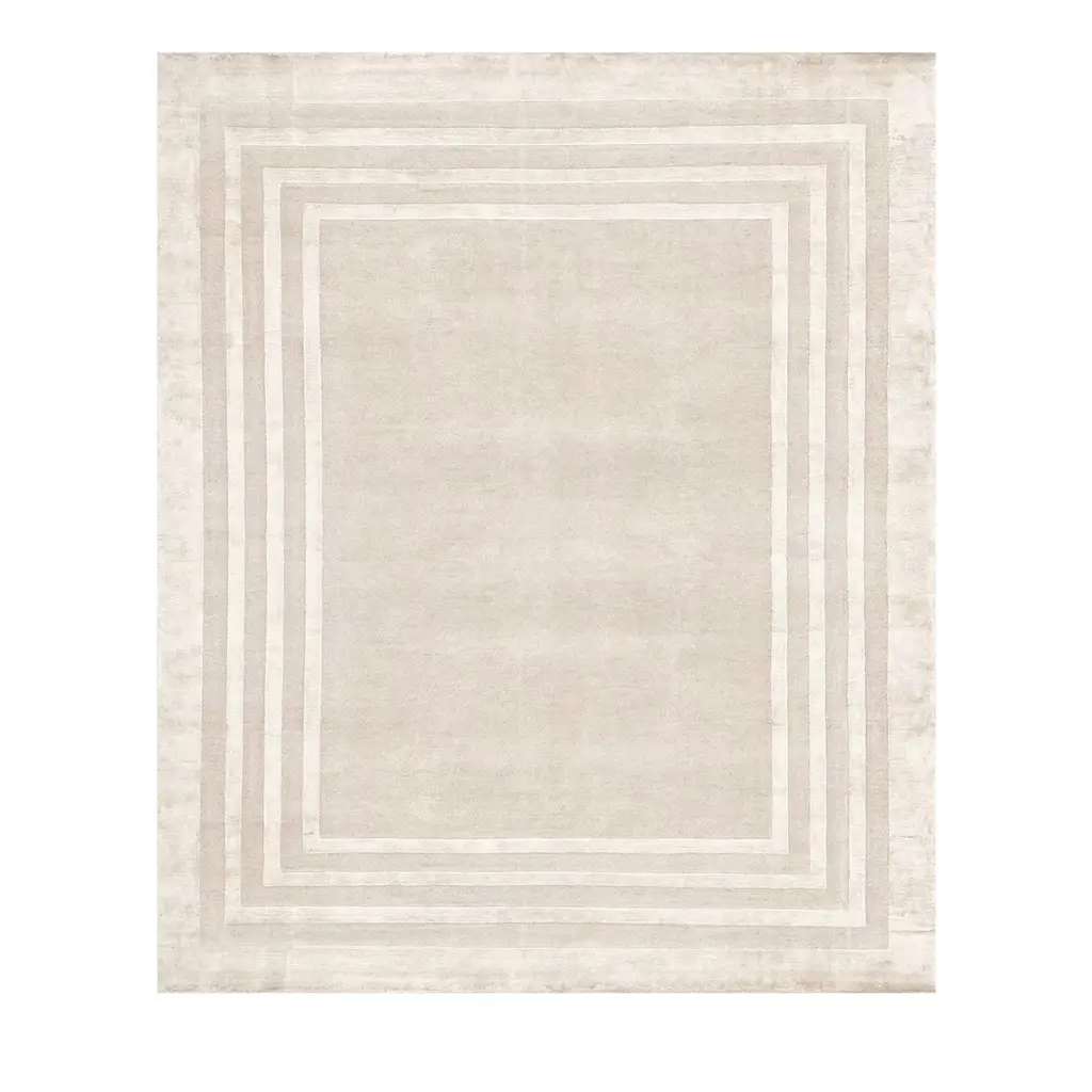 The warmth of Himalayan wool and the shimmering effect of fine silk create this welcoming rug, whose .05cm-high base flaunts a sober design (H .07cm) of concentrical frames of quiet elegance. This 152,000 knot/sqm piece is hand-knotted by Nepalese artisans and features a total combination of 20% silk and 80% wool rendered in delicate shades of beige and taupe. A wide range of customizations as well as an anti-stain treatment are available, please ask the Concierge for options and pricing.