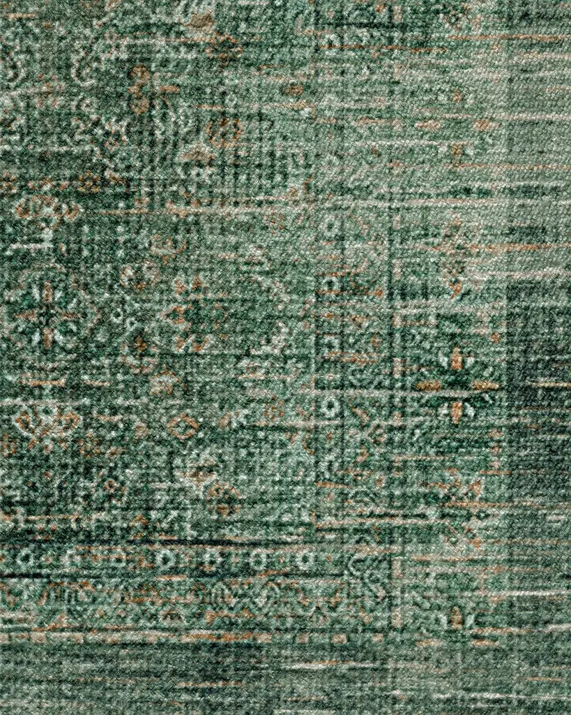 Elegant. Timeless. Inviting. Inspired by vintage jacquard textiles, our Frances Jade Green Rug features a design composed of repeated artistic motifs. Deep greens mix harmoniously with softer jades, while rich gold accents and delicate cream details add warmth and elegance to the overall design. Its inviting palette and antique texture brings an air of elegance to any room. Water-resistant, stain-resistant, and machine-washable. Rug colors may vary slightly according to your device and the lighting in your space.