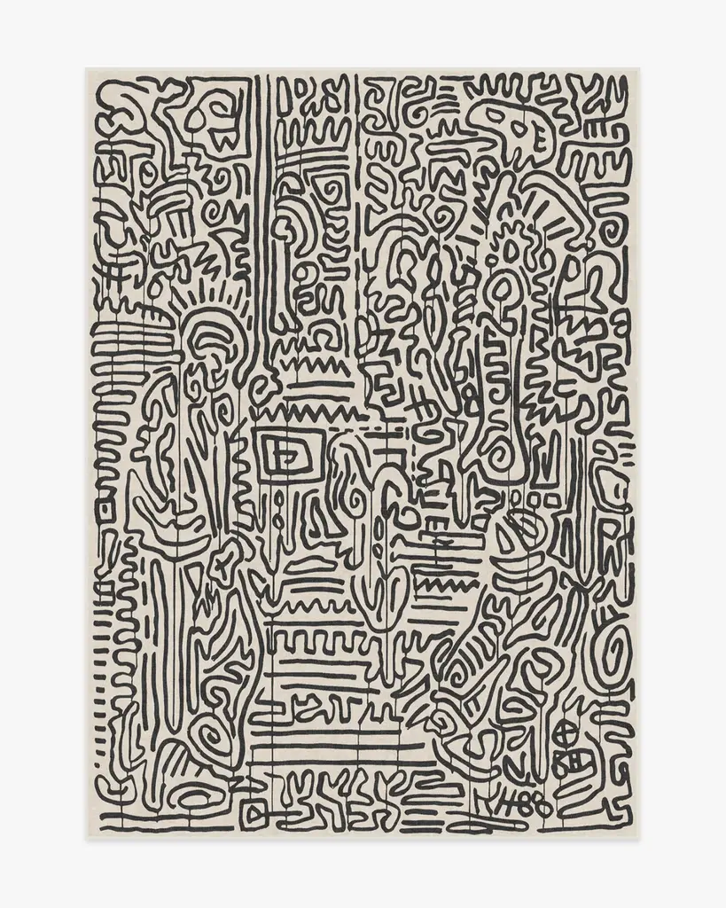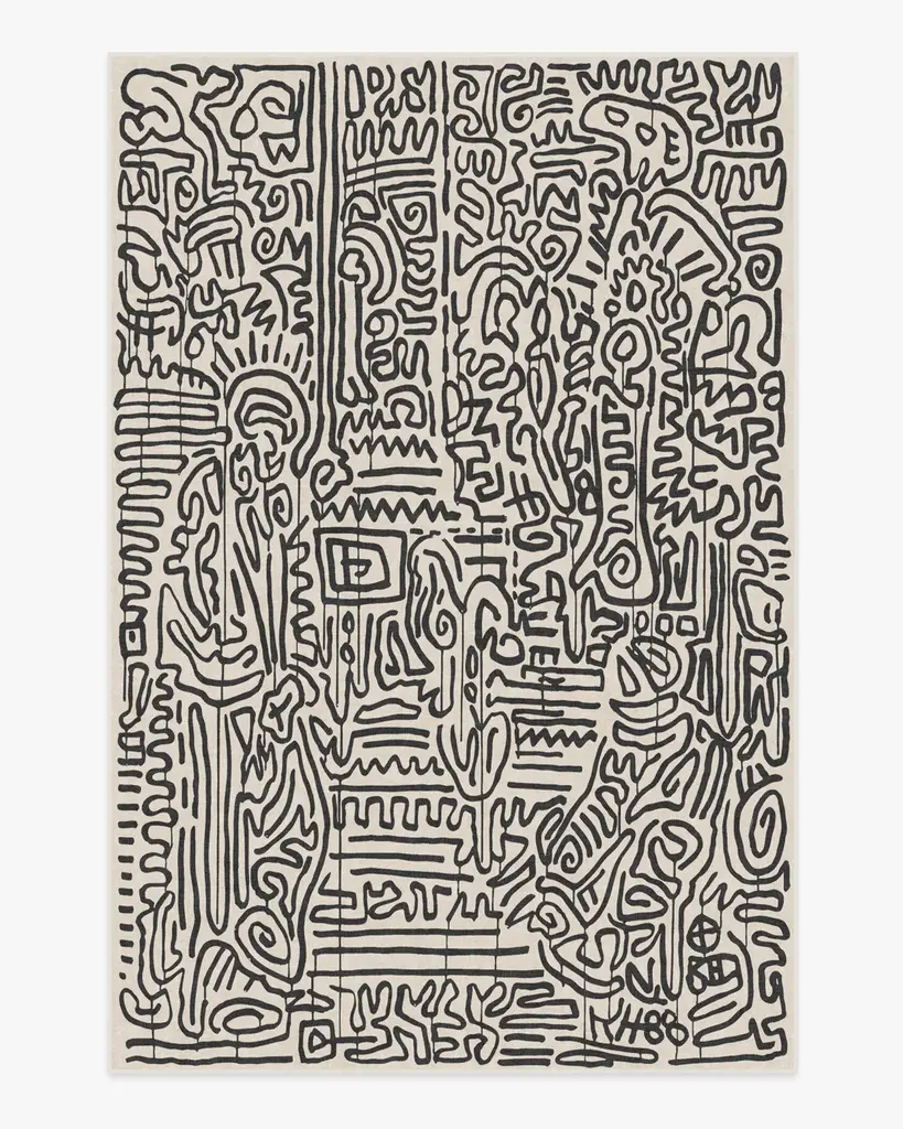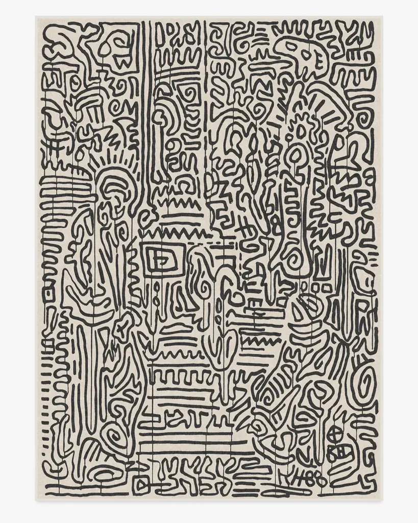 Edgy and modern. Our Keith Haring Freestyle Black and Ivory Rug features a single-line design of dark grey on an off-white background and is sure to catch the eye anywhere it's placed. Water-resistant, stain-resistant, and machine-washable.