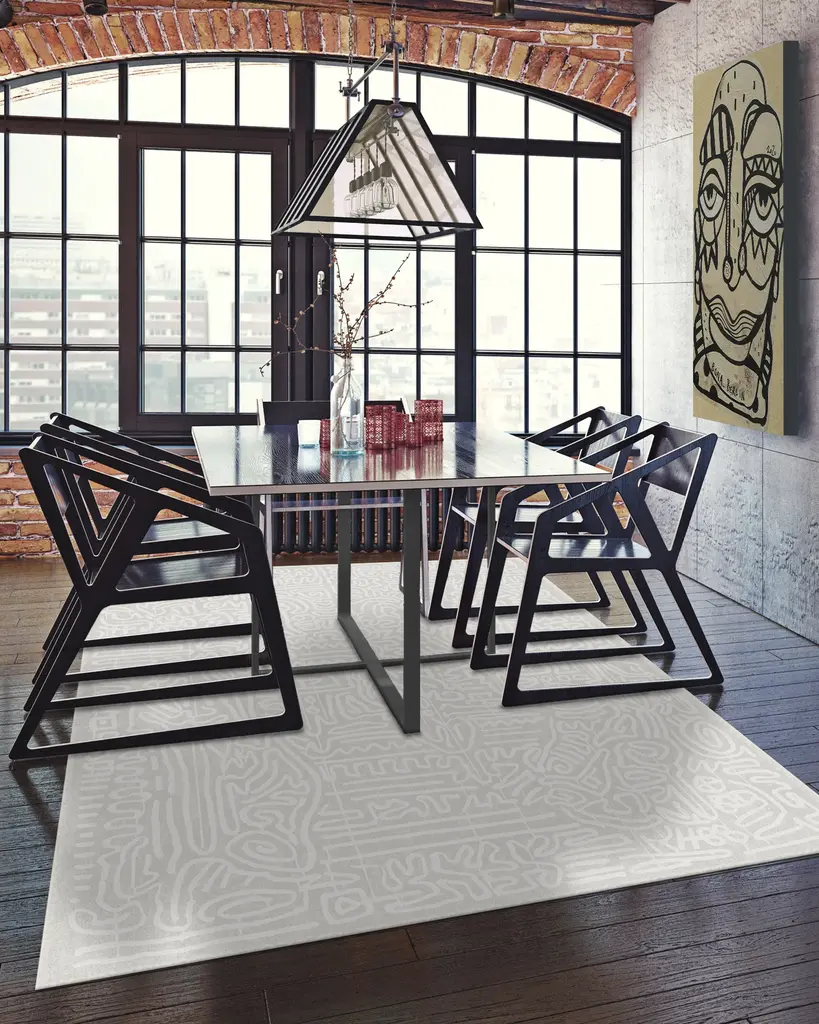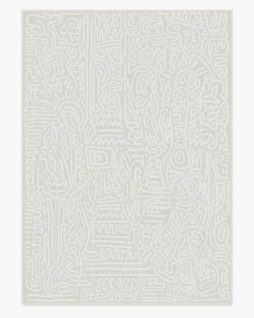 Freestyle fine art for your home. Our ornate Keith Haring Freestyle Pearl Rug features a single line design by the artist in off-white on a sandy pearl background for a subtle yet striking balance. Water-resistant, stain-resistant, and machine-washable.