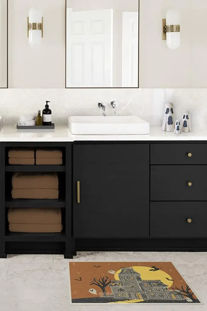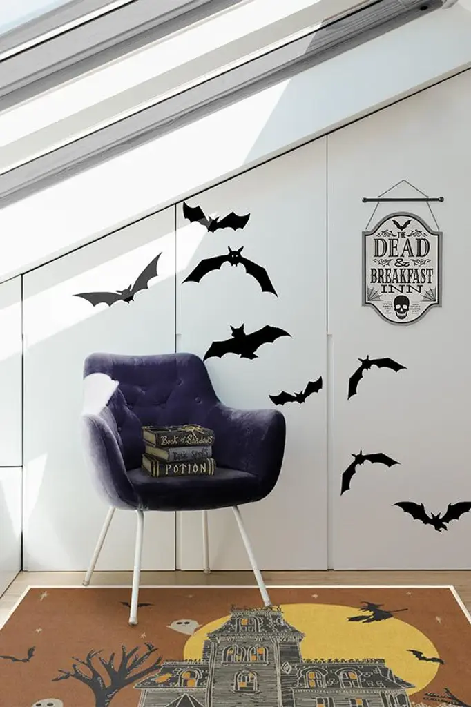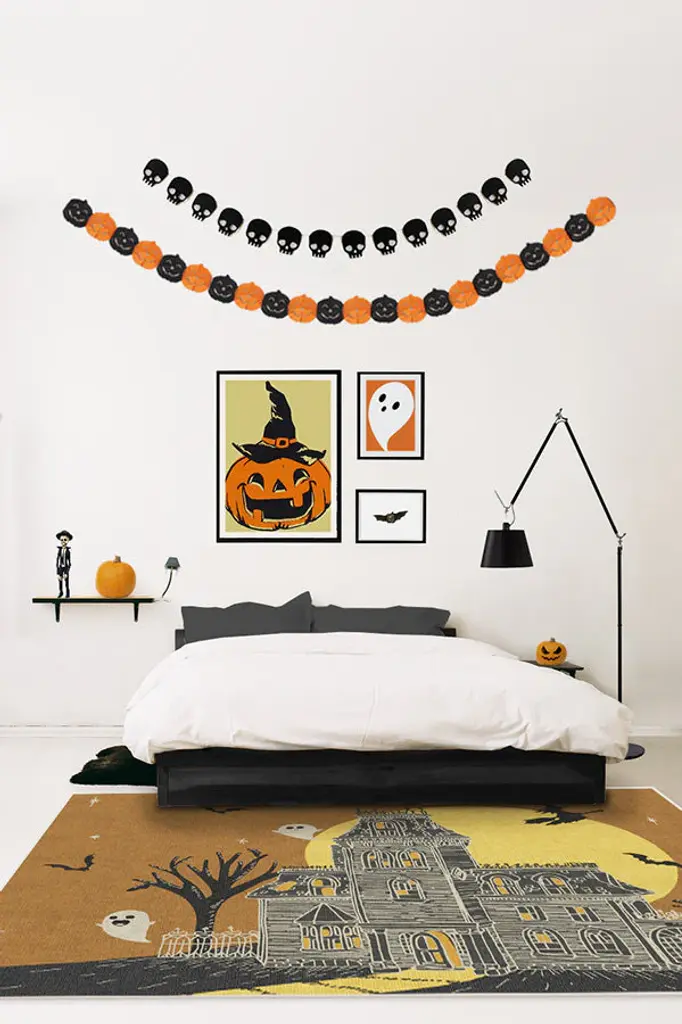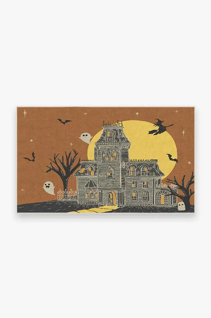 This Halloween season, give your guests a haunting hello with the Fright Night Rug. Set against a rust orange background and a big yellow full moon, this rug features a creepy haunted house at the center surrounded by a witch on a broomstick, ghosts, and bats. A fun take on this familiar theme, this rug will surely set a chilling tone to your Halloween party and decor.