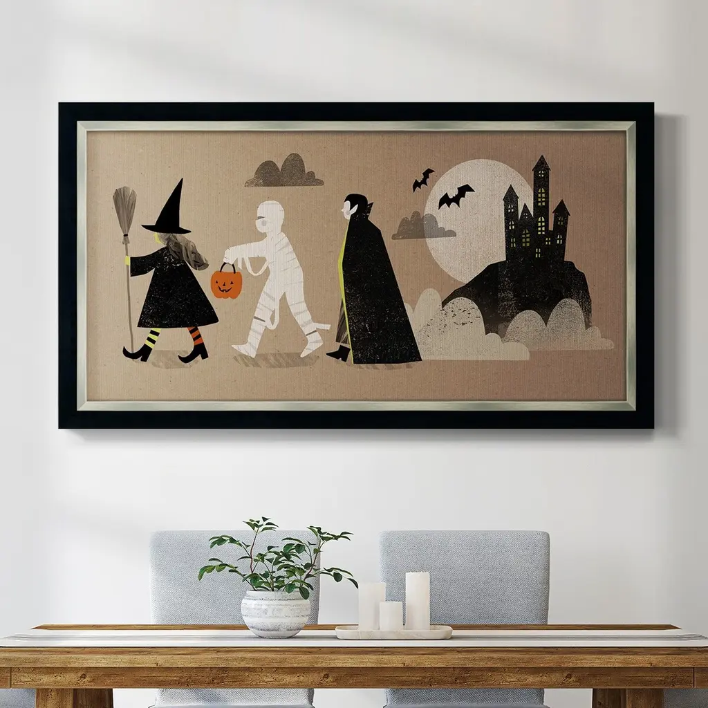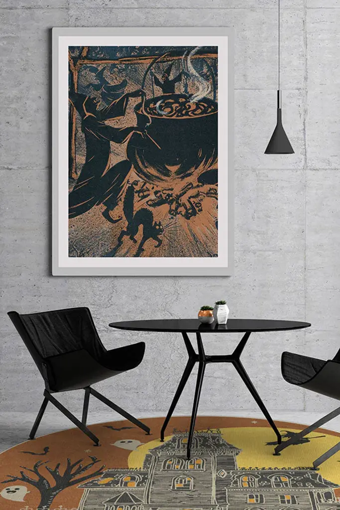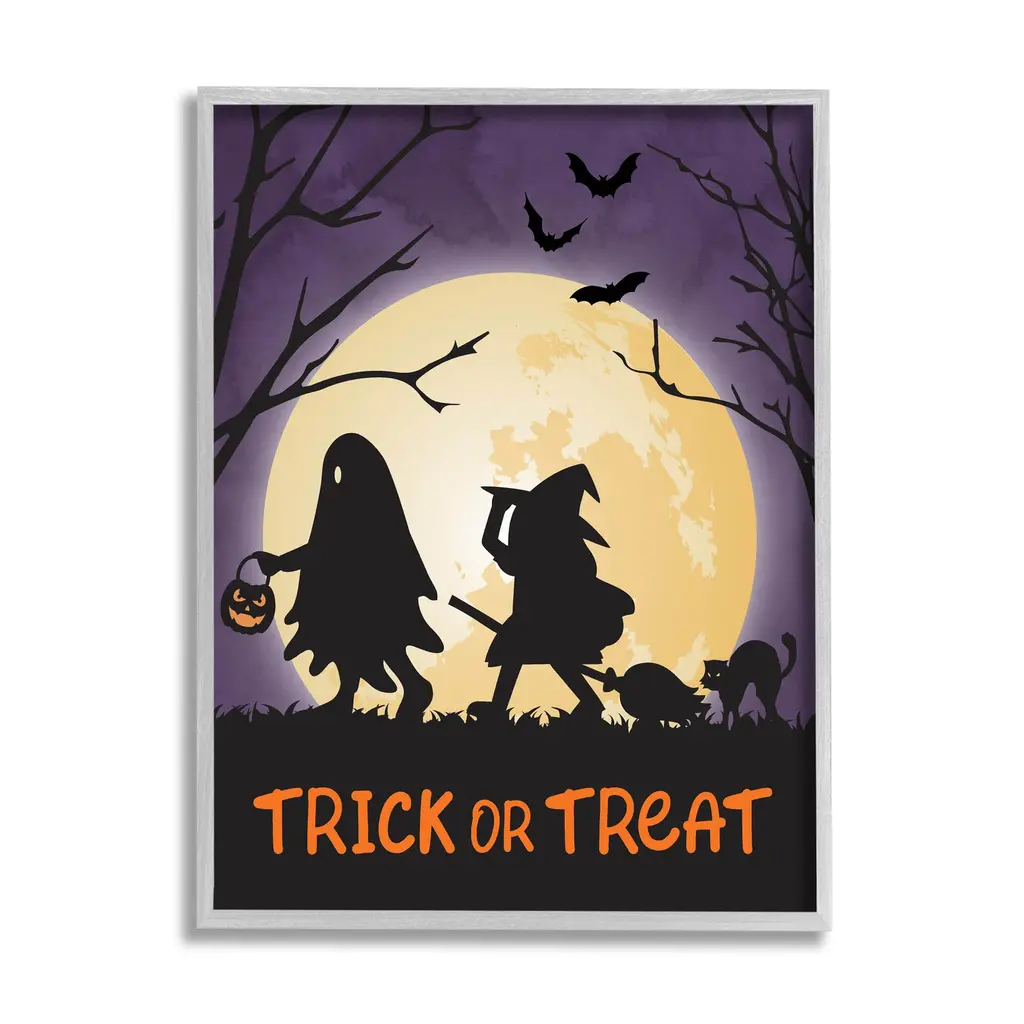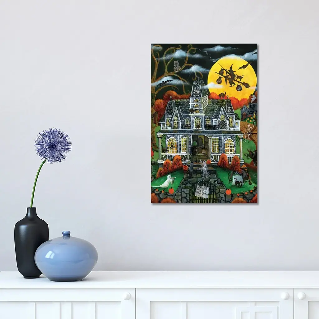 This Halloween season, give your guests a haunting hello with the Fright Night Rug. Set against a rust orange background and a big yellow full moon, this rug features a creepy haunted house at the center surrounded by a witch on a broomstick, ghosts, and bats. A fun take on this familiar theme, this rug will surely set a chilling tone to your Halloween party and decor.