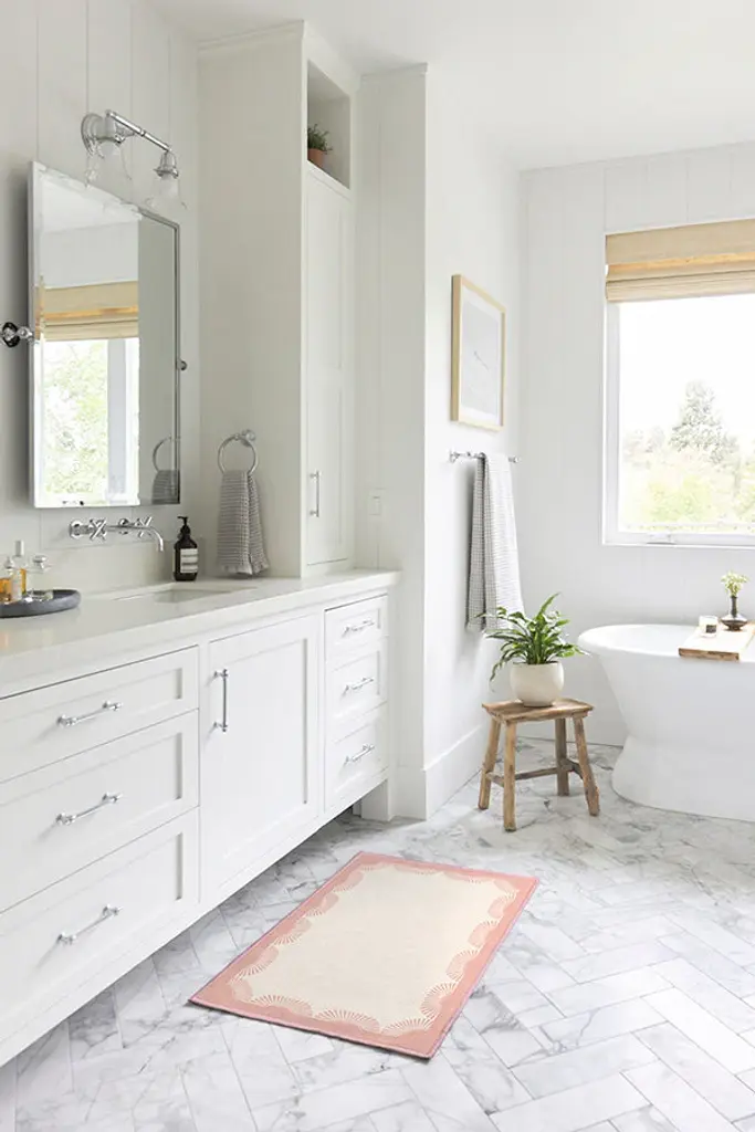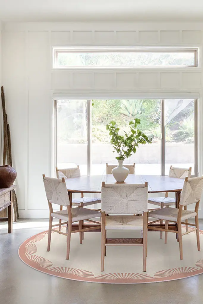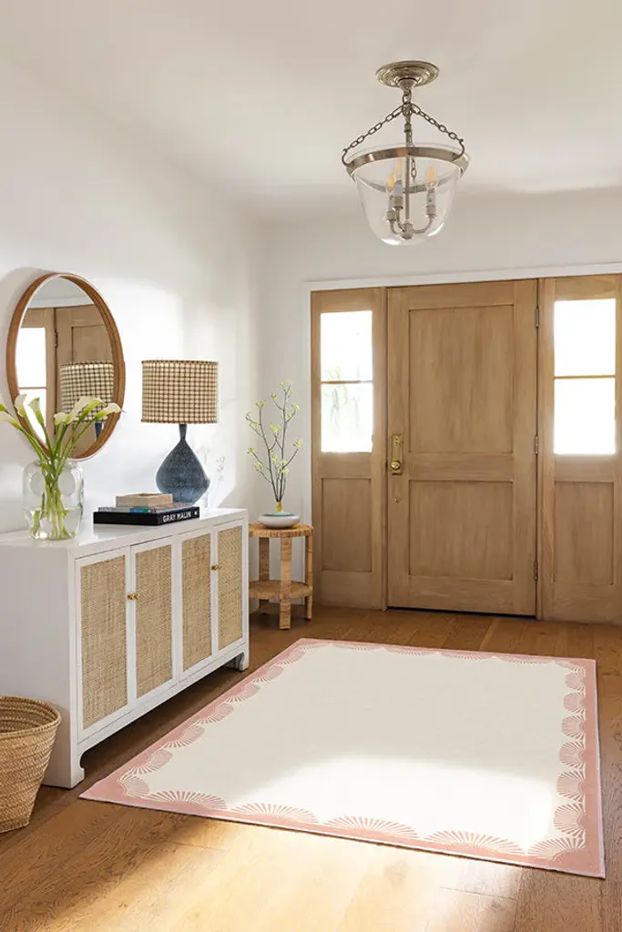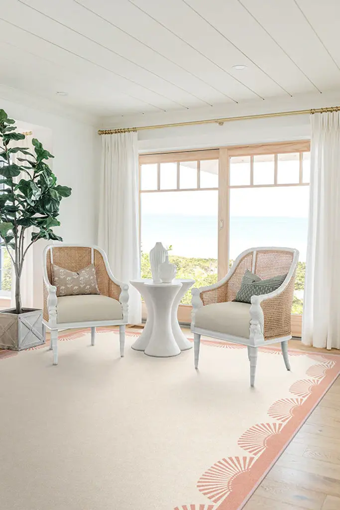Your coastal oasis awaits with our Gray Malin Fringe Pink & Ivory Rug. Inspired by the tassel-trimmed umbrellas of Gray's photography of the Italian Riviera, this soft ivory rug features a scalloped border of playful pink. Water-resistant, stain-resistant, and machine-washable. Rug colors may vary slightly according to your device and the lighting in your space.