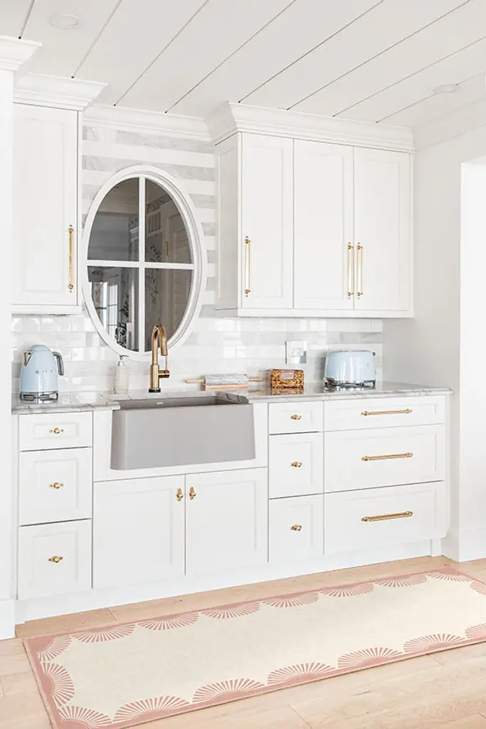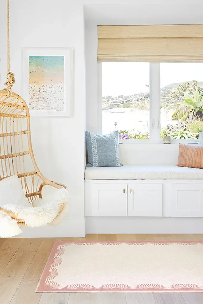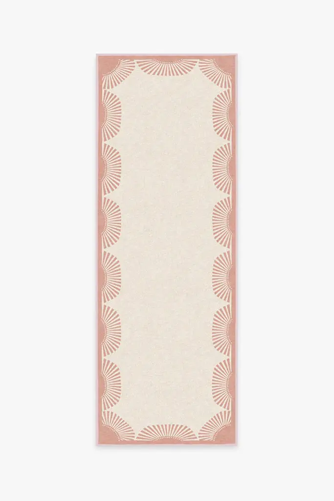 Your coastal oasis awaits with our Gray Malin Fringe Pink & Ivory Rug. Inspired by the tassel-trimmed umbrellas of Gray's photography of the Italian Riviera, this soft ivory rug features a scalloped border of playful pink. Water-resistant, stain-resistant, and machine-washable. Rug colors may vary slightly according to your device and the lighting in your space.