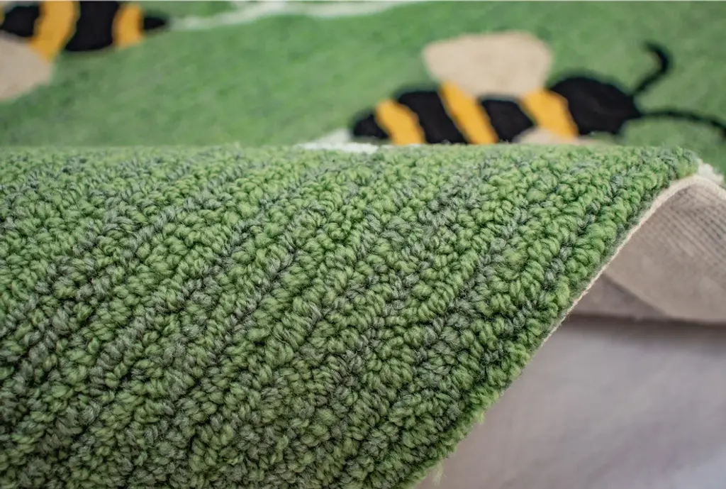 Any nature lover will surely enjoy this playful novel design featuring lovely honeybees. The richly blended colors will add color to any d�cor. Hand hooked of weather-resistant fiber, this collection is a blend of comfort, softness and durability. Frontporch is remarkably easy to clean and treated for added fade resistance. Limiting exposure to rain, moisture and direct sun will prolong mat life.