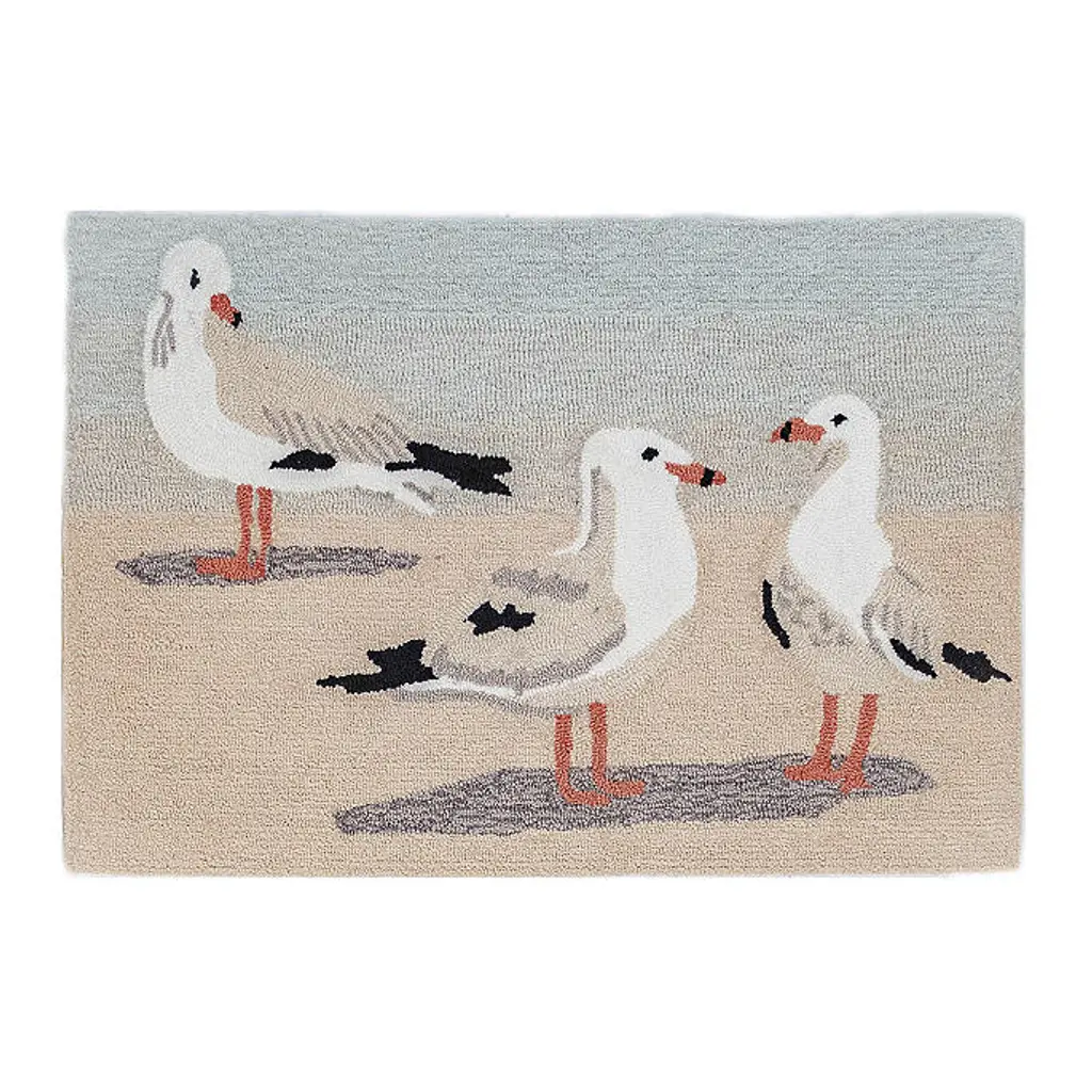 Add some whimsy and personality to your space with our delightful coastal rug featuring Gulls by the shoreline being social. A perfect little accent to your decor. Hand hooked of weather-resistant fiber, this collection is a blend of comfort, softness and durability. Frontporch is remarkably easy to clean and treated for added fade resistance. Limiting exposure to rain, moisture and direct sun will prolong mat life.