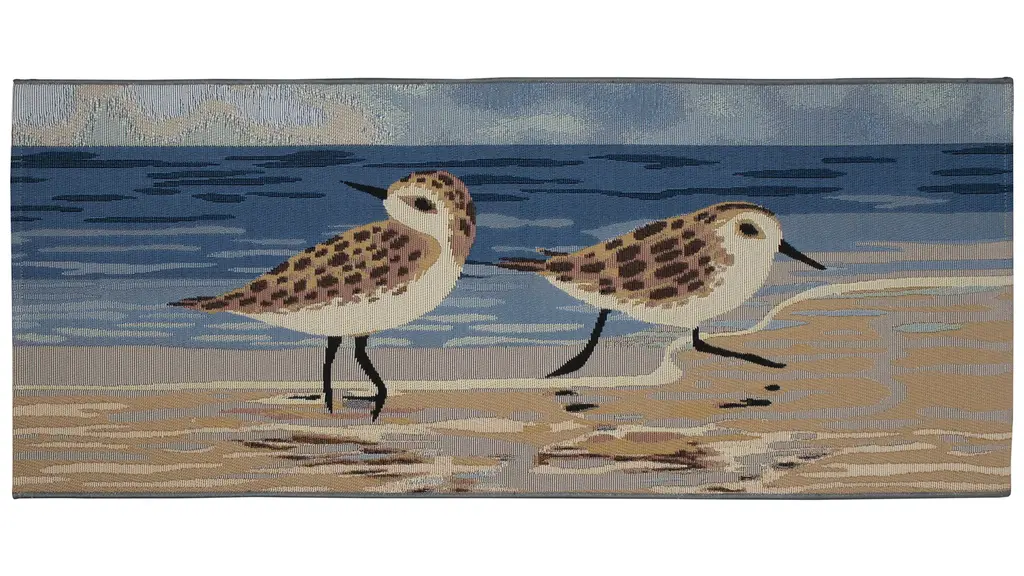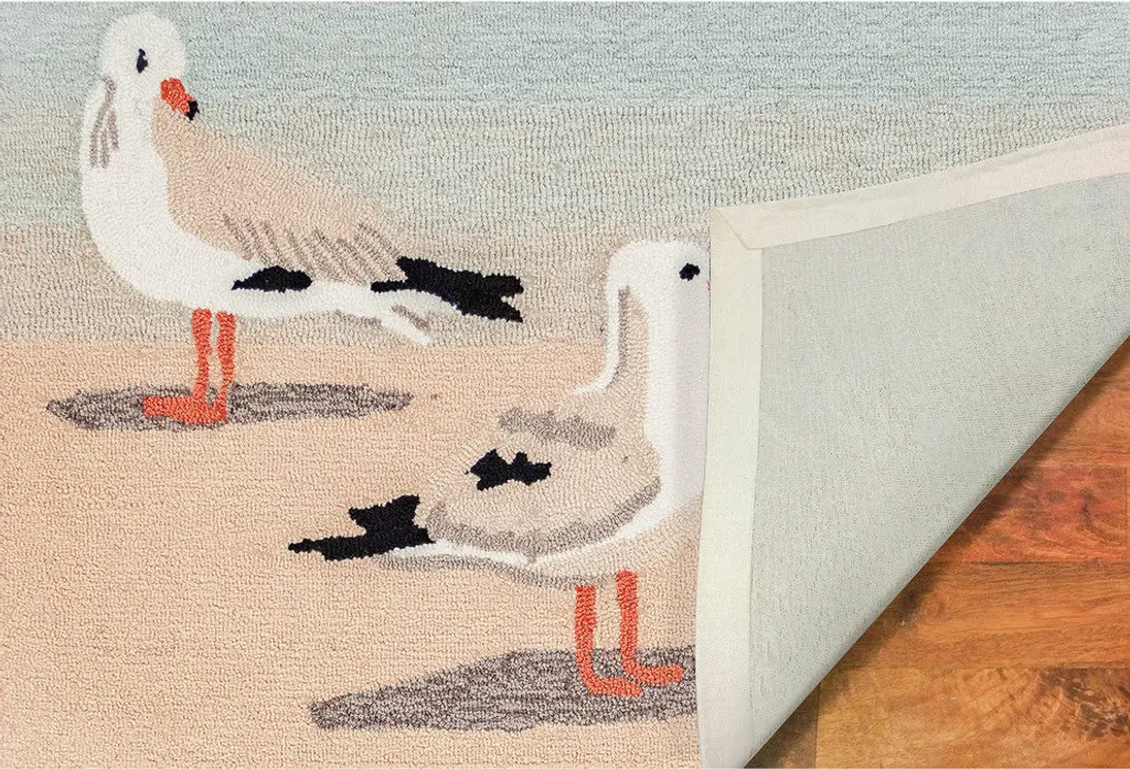 Add some whimsy and personality to your space with our delightful coastal rug featuring Gulls by the shoreline being social. A perfect little accent to your d�cor. Hand hooked of weather-resistant fiber, this collection is a blend of comfort, softness and durability. Frontporch is remarkably easy to clean and treated for added fade resistance. Limiting exposure to rain, moisture and direct sun will prolong mat life.