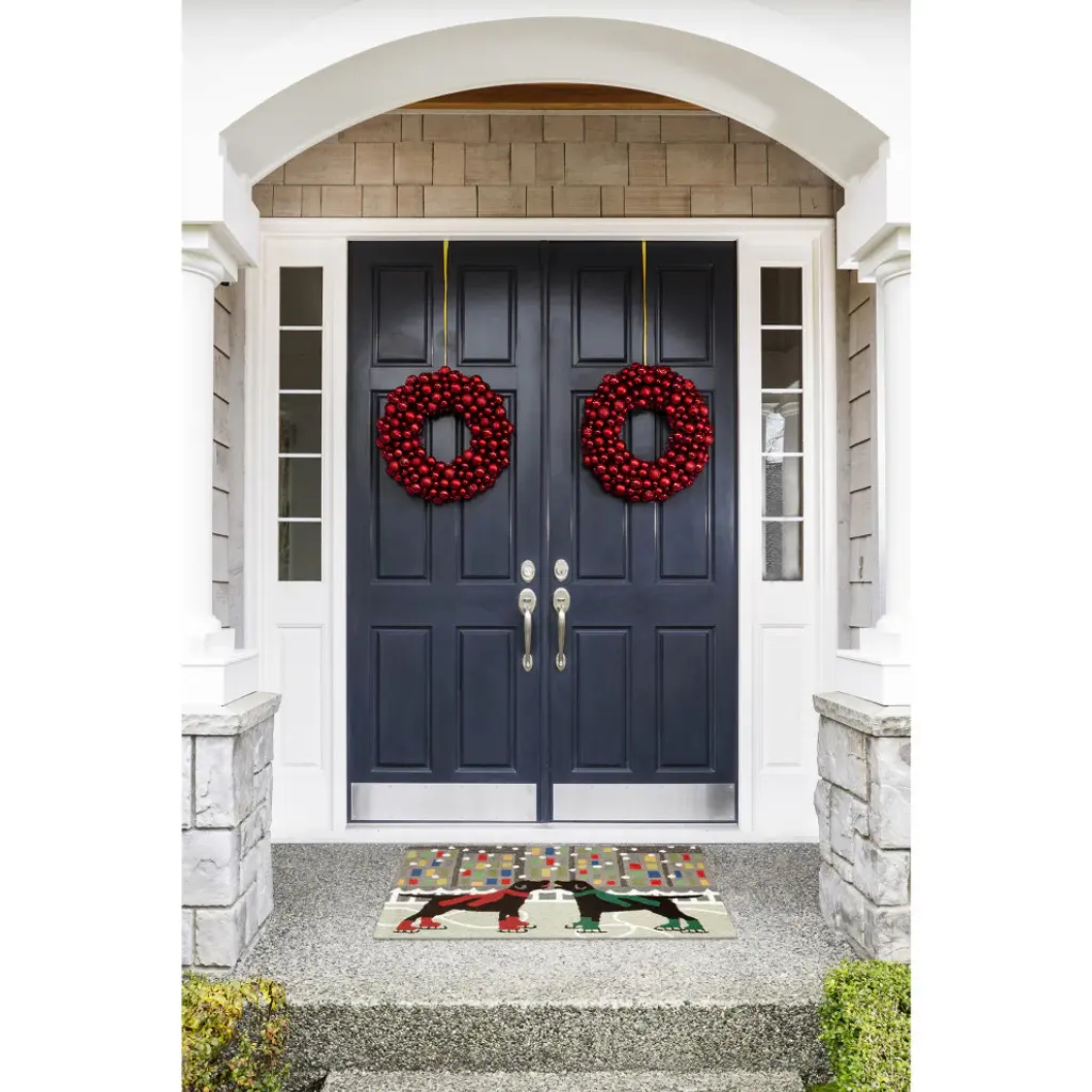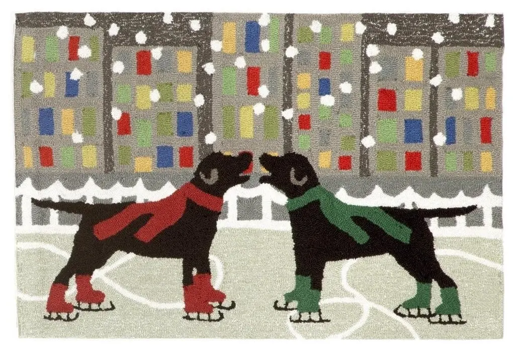 Two dogs get into the holiday spirit with green and red scarves and matching ice skates in this whimsical wintery scene. This happy scene makes this mat the perfect accent to welcome guests at your door, at your kitchen sink, or in any space inside or outside your home. Made in China from a polyester/acrylic blend, the Frontporch Collection is hand tufted to create detailed designs with intricately blended colors for a high-quality finish. The material is hand hooked to create both softness and durability with weather resistant and added fade resistant treatment that is remarkably easy to clean. These pieces are perfect for you patio, entryway, bathroom, laundry room and kitchen making this the ideal indoor or outdoor rug. Fun, casual and unique these vibrant, crisp and detailed patterns range from coastal, farmhouse, novelty sayings, pets and traditional designs to perfectly accent your home. Limiting exposure to rain, moisture and direct sun will prolong rug life.Features:Expertly hand tufted crafted and imported from ChinaIntended for both Indoor and Outdoor UseMade from a weather and fade resistant polyester/acrylic blend for high traffic areas and Indoor/Outdoor placementPile height 0.375"Both Water and Fade ResistantBacking Material: PolyesterTwo dogs practice their skating on the ice in this adorable holiday sceneDesigned by Liora ManneDesigned with black, green and red accents on a grey and white backgroundRug Size: 2'' x 3''