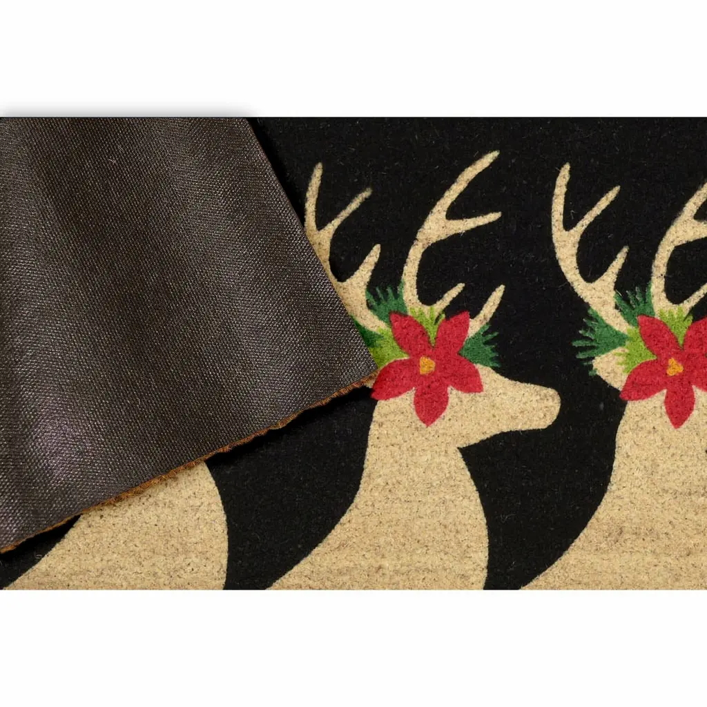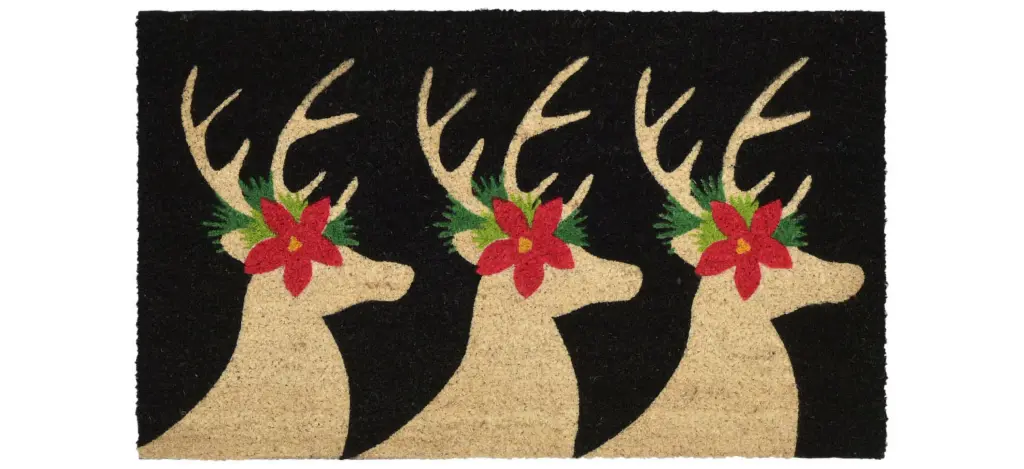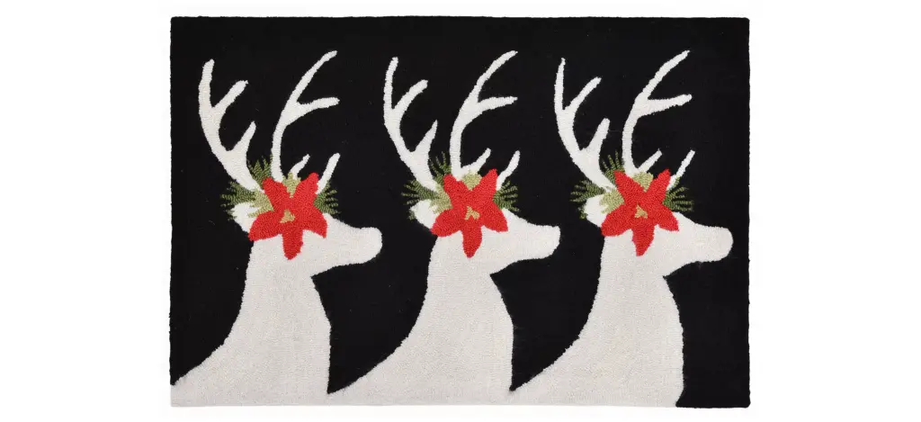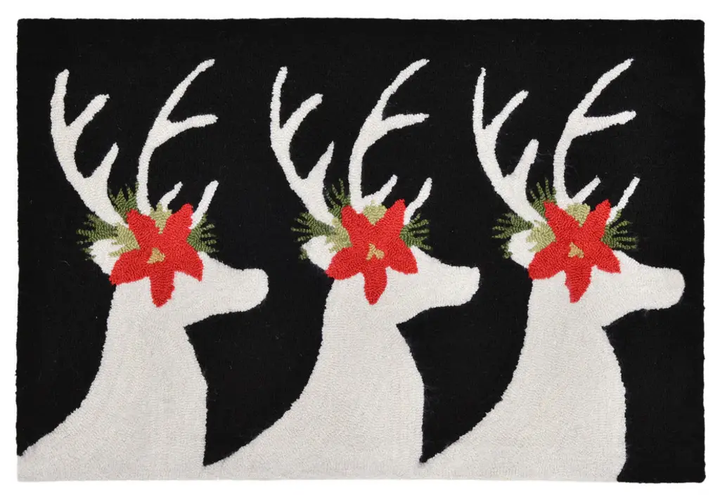 A bold black background highlights the white reindeer silhouettes accented by a red and green flower. This simple design effortlessly brings the holiday spirit to your home. This happy scene makes this mat the perfect accent to welcome guests at your door, at your kitchen sink, or in any space inside or outside your home. Made in China from a polyester/acrylic blend, the Frontporch Collection is hand tufted to create detailed designs with intricately blended colors for a high-quality finish. The material is hand hooked to create both softness and durability with weather resistant and added fade resistant treatment that is remarkably easy to clean. These pieces are perfect for you patio, entryway, bathroom, laundry room and kitchen making this the ideal indoor or outdoor rug. Fun, casual and unique these vibrant, crisp and detailed patterns range from coastal, farmhouse, novelty sayings, pets and traditional designs to perfectly accent your home. Limiting exposure to rain, moisture and direct sun will prolong rug life.Features:Expertly hand tufted crafted and imported from ChinaIntended for both Indoor and Outdoor UseMade from a weather and fade resistant polyester/acrylic blend for high traffic areas and Indoor/Outdoor placementPile height 0.375"Both Water and Fade ResistantDesigned with white, red and green accents on a black backgroundRug Size: 1''8" x 2'' 6"
