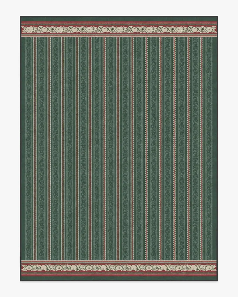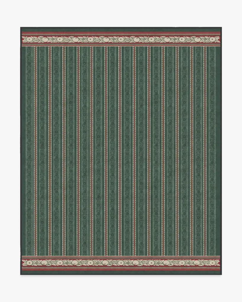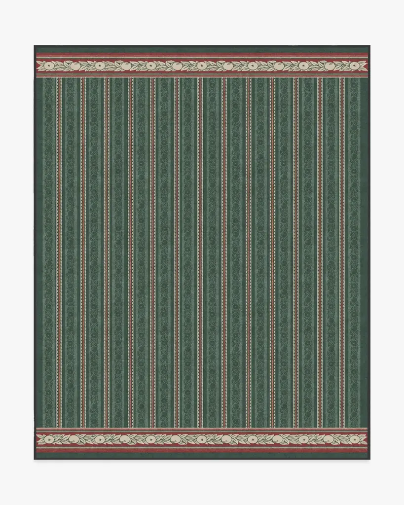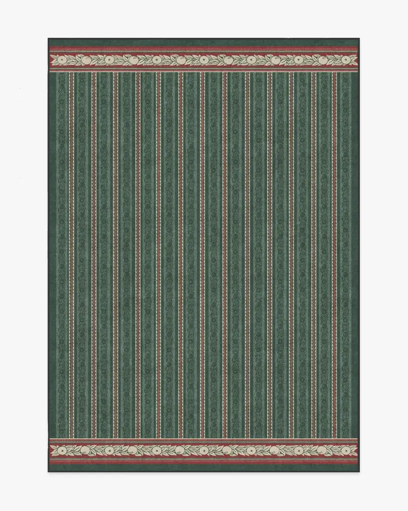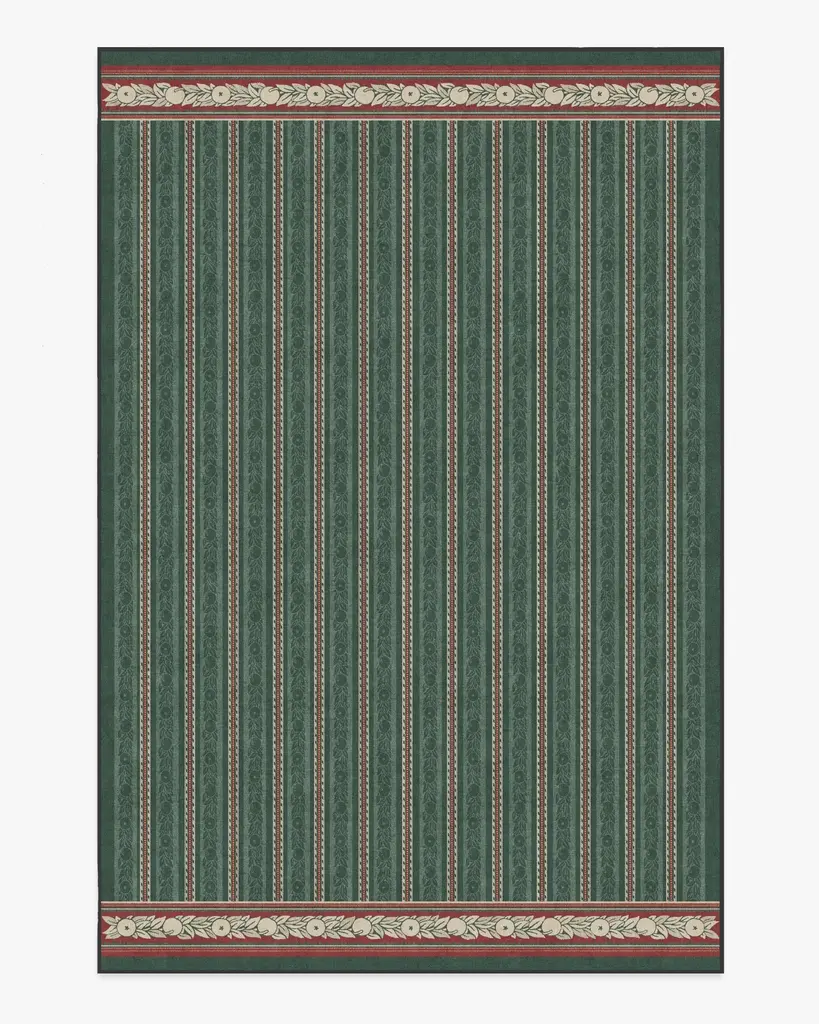 Bring heritage home for the holidays with our Morris & Co. Fruit Stripe Spruce Green Rug. Featuring elements of Morris' iconic 1864 Fruit motif artfully blended with a simple stripe pattern, this ornate design serves as a captivating centerpiece. With a palette of bold reds and soft vintage creams against an evergreen background, it's perfect for both seasonal celebrations and everyday use. Water-resistant, stain-resistant, and machine-washable. Rug colors may vary slightly according to your device and the lighting in your space.