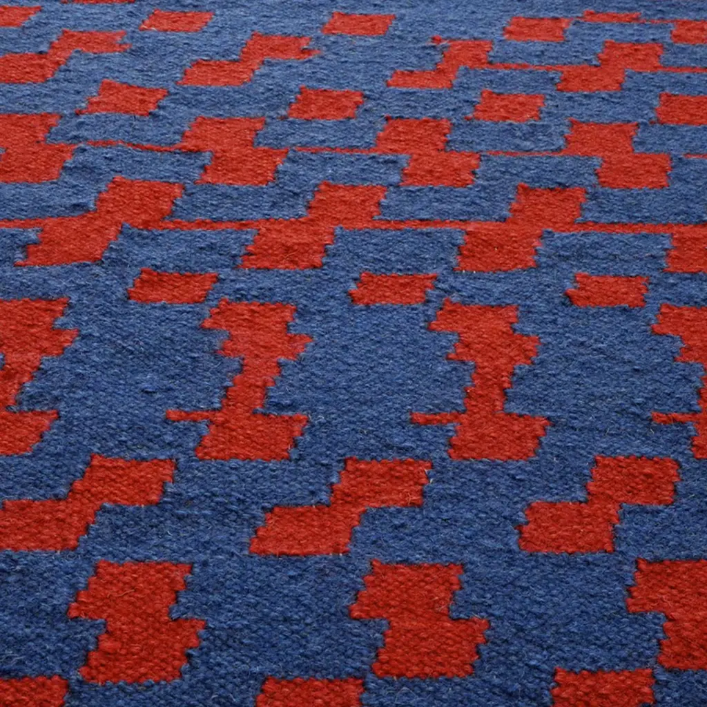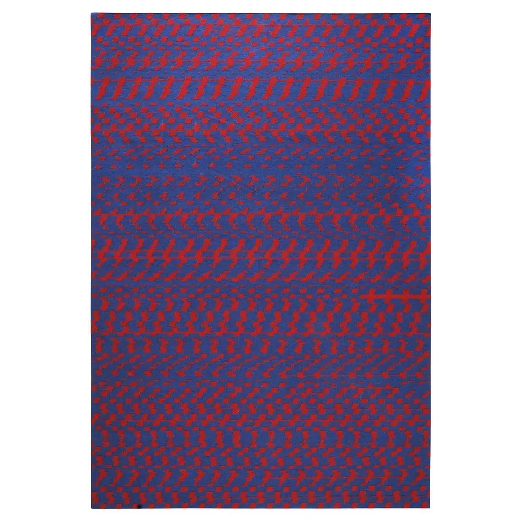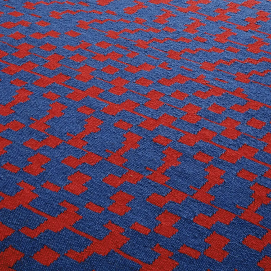 This work of design is part of the Fuoritempo collection which is a collection inspierd by musical rythms. The Fuoritempo Carpet presents an elegant combination of the colors red and blue. The lightness of a traditional Kilim s combined with the strength of contemporary visual design.