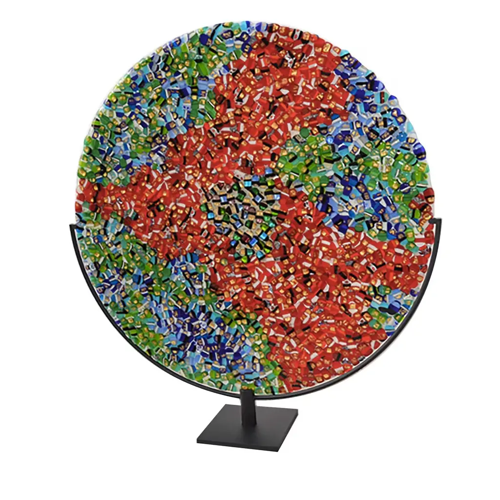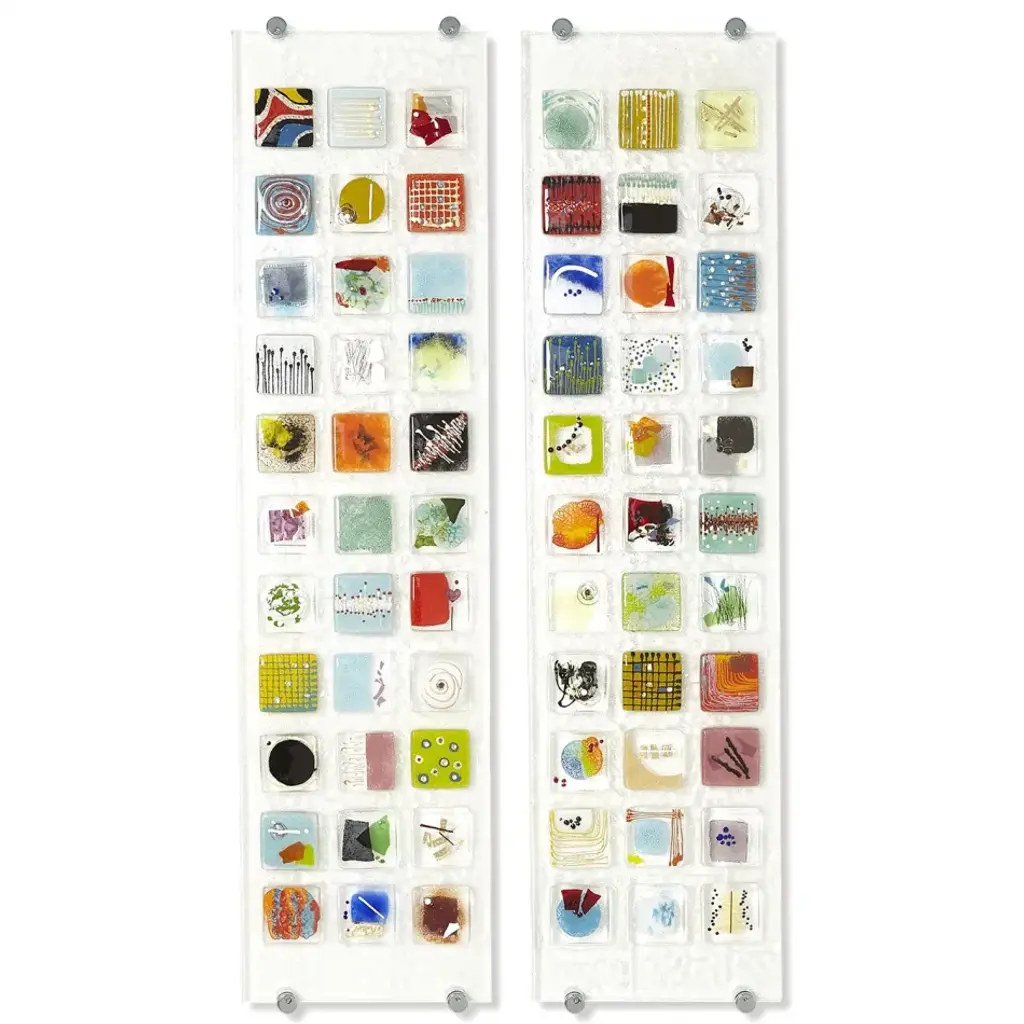 Unique Portuguese fused art glass with 33 individual artistic tiles. There are two wall panel versions and no two tiles are the same. Held in place by stainless steel mounting hardware allowing panels to be hung vertically or horizontally. From a fashion forward perspective, Global Views offers accessories, furniture, statement lighting, and an assortment of rugs and mirrors to add beauty and joy to your home.