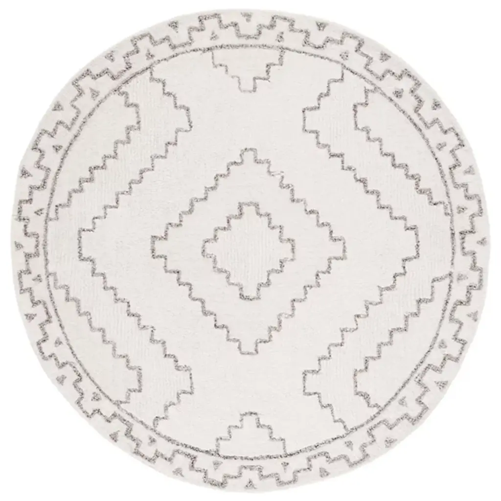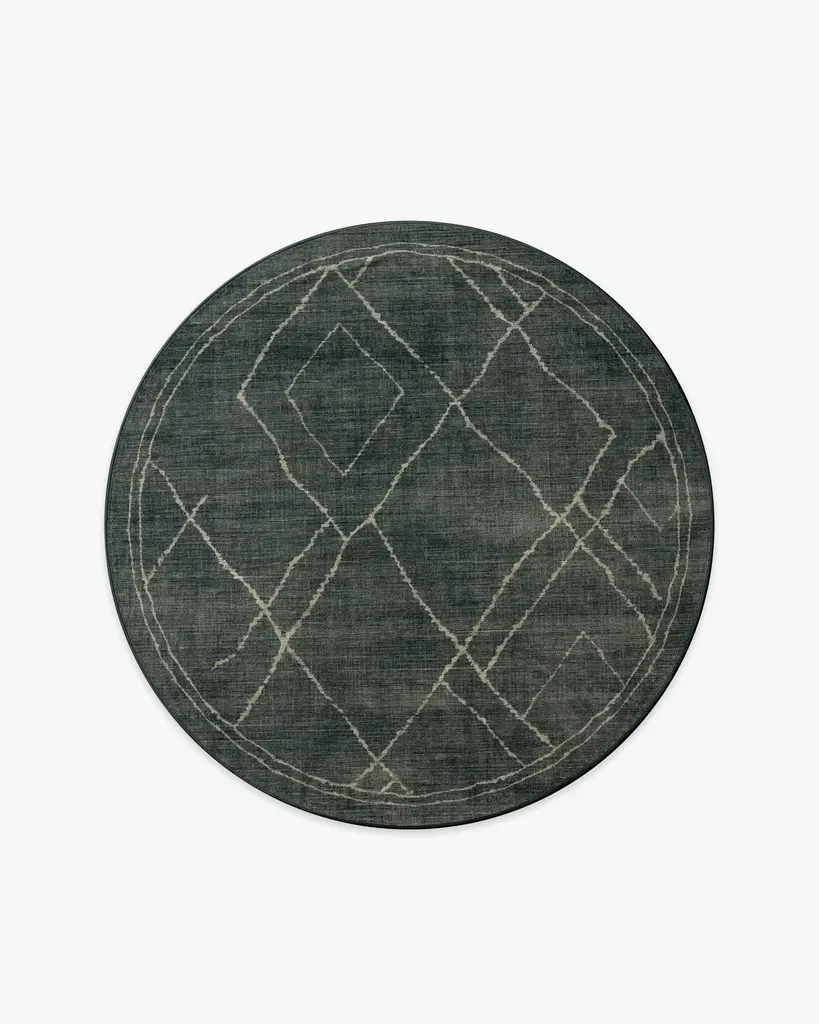 The Fydor Round Rug from Alder & Ore offers a memorable blend of bohemian charm and geometric elegance. Hand-tufted in India from a luxurious wool, polyester, and cotton blend, this round rug shows off a subtle diamond motif framed by graceful dark lines on a soft, pale background. Its intricate design and artisanal craftsmanship bring a sense of refined texture and artistic character to any space.