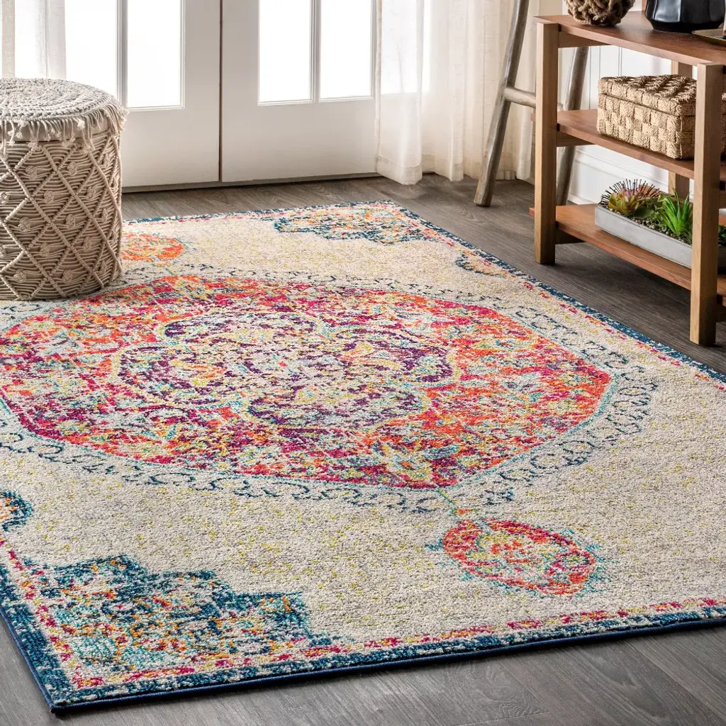 Boho chic, this rug features a Persian-inspired pattern on a beige background with bright contrasting accent colors including burnt orange, teal, garnet, and yellow. Gorgeous and soft, this rug features a comfortable pile with minimal shedding thanks to its power loomed construction. With the oversized scale of the center medallion and thin frame, this rug makes any small space look larger, a visual trick employed by designers for decades.