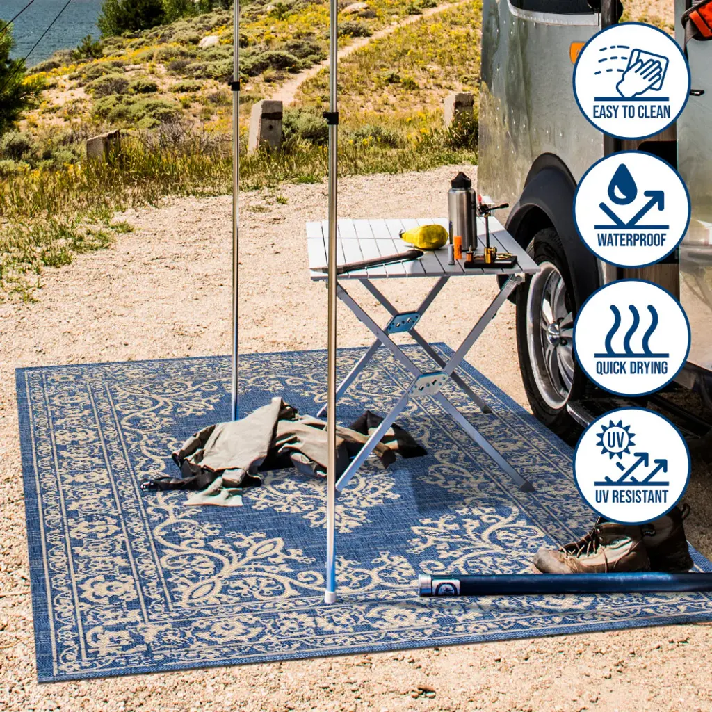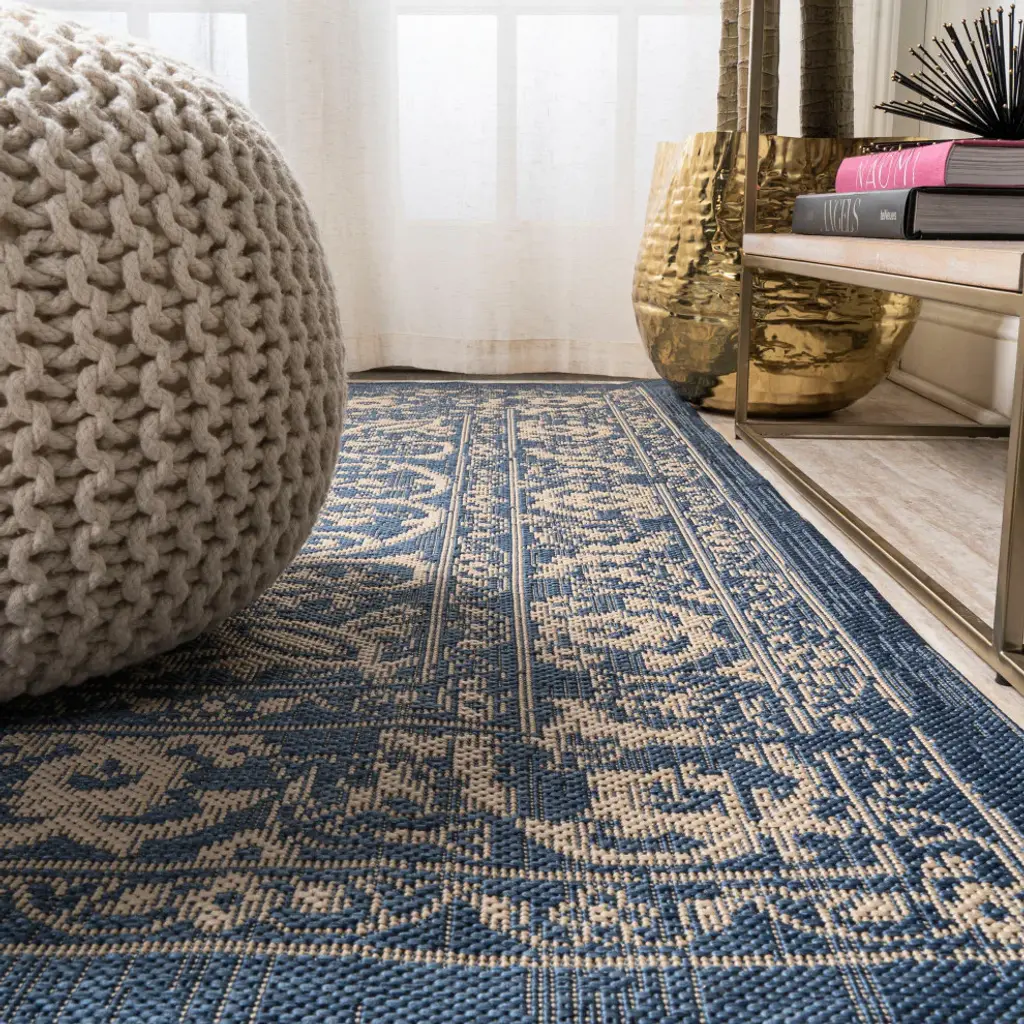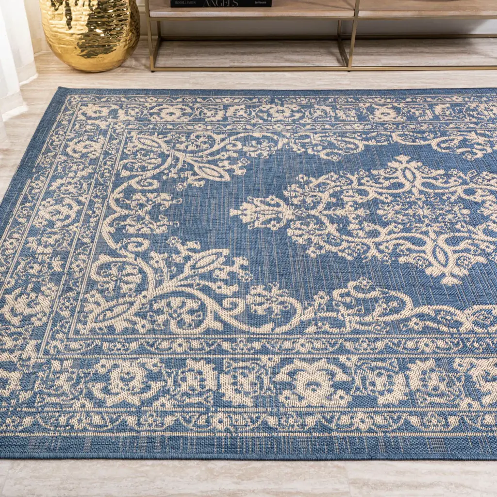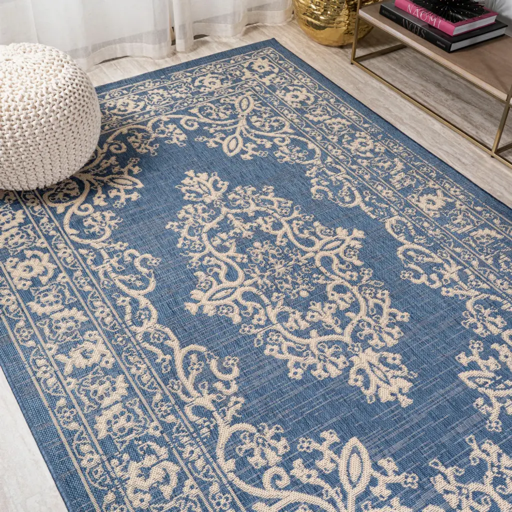 This ornate medallion rug''s filigree pattern adds dreamy Bohemian cottage style to your patio, porch or sunroom. Inspired by Mediterranean wrought iron designs, the ivory pattern on a blue background gives this outdoor rug a hand-woven, vintage vibe. The busy pattern is ideal for your entry, kitchen, hallway, living room or bedroom too. The pet-friendly and kid-proof flatweave design makes it easy to clean, and perfect for the beach house.Features:• Flat-weave construction of 100% polypropylene• Durable and easy-care - just sweep or hose down with mild soap and water• 100% Polypropylene• No backing, use of rug pad is recommended (sold separately)• Power Loomed in Turkey• Thickness measures: 0.19 in.• Available in multiple sizes and/or colorsRug Care:• Durable and easy-care - just sweep or hose down with mild soap and water• Packing and shipping may cause temporary creases in rugs, which will flatten out after a week on the floor; to expedite the process, try back-rolling your rug before laying it down, and then allow ample time for the remaining creases to relax• Please Note: Due to differences in monitors, some rug colors may vary slightly. Lengths and widths may vary from the published dimensions. Patterns may vary slightly according to shape and size selected.About us:Style your floors with JONATHAN Y. By combining fine craftsmanship and design, this New York creative studio is bringing fashion to your floors. The collection mixes sustainable organic materials, vibrant colors and trend worthy styles to create JONATHAN Y''s distinctive catalog of rugs.