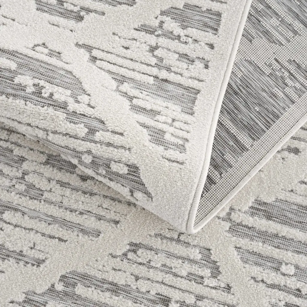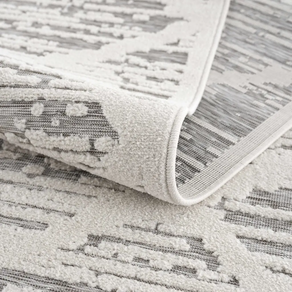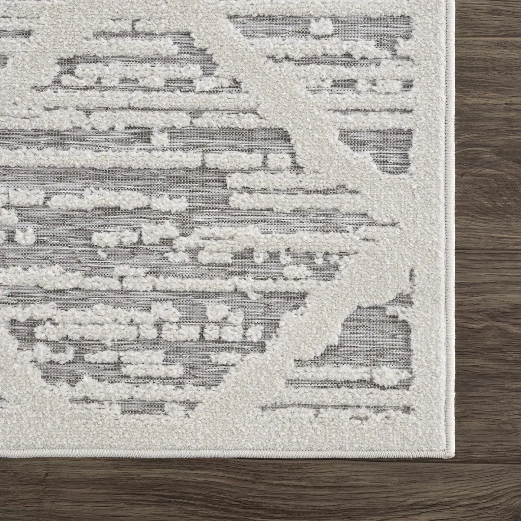 Collection: Gambang Colors: Off White, Medium Gray Construction: Machine Woven Material: 100% Polypropylene Pile: Low Pile Pile Height: 0.14" Styles: Transitional,Bohemian Outdoor Safe: Yes Made In: Turkey Thickness: 0.2" Price Range: $$$$$ (Most Affordable)