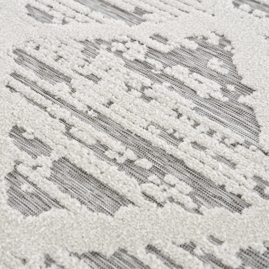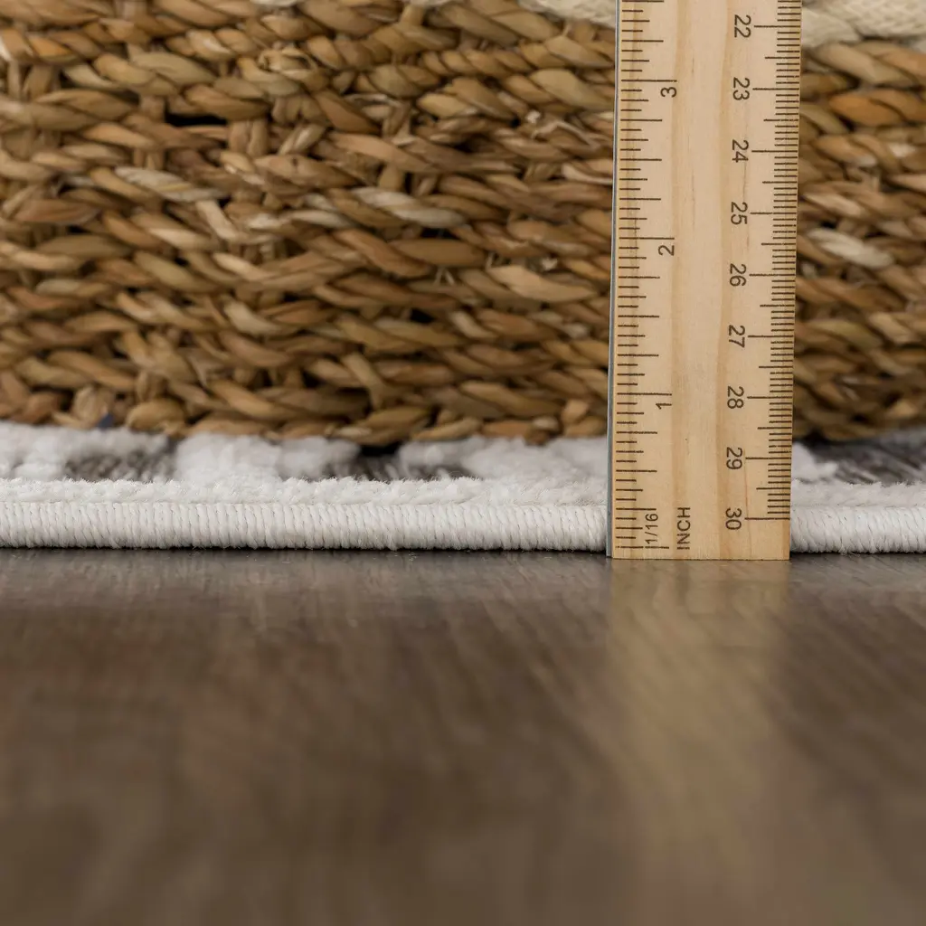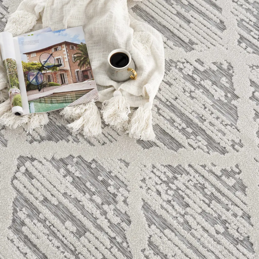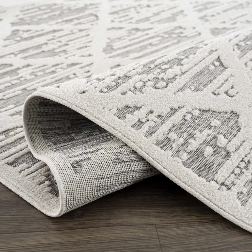 Collection: Gambang Colors: Off White, Medium Gray Construction: Machine Woven Material: 100% Polypropylene Pile: Low Pile Pile Height: 0.14" Styles: Transitional,Bohemian Outdoor Safe: Yes Made In: Turkey Thickness: 0.2" Price Range: $$$$$ (Most Affordable)