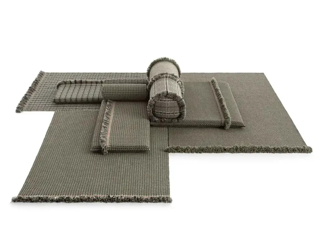 GARDEN LAYERS, GAN’S FIRST OUTDOOR SPACE design by PATRICIA URQUIOLA for GAN.There exist artists who know no boundaries and there are journeys that changeeverything.Patricia Urquiola travelled to India where she was captivated by the delicacy and harmony of the Mongol architecture she found there. Gardens, terraces and miniatures found their way into her restless imagination inspiring a new collection which from the very first spark of creativity she wanted to be for the outdoors.Hand in hand together with her GAN sets its sights on new horizons.GARDEN LAYERS, the first outdoor adventure under the framework of the GAN Spaces series is a collection made up of rugs, mats, roll pillows and cushions that can be arranged in different ways together, with infinite possibilities for outdoor living.The influence of the Orient in GARDEN LAYERS is evident in terms of the way it invites reclined relaxation on rugs and mats, supported on roll pillows and stuffed cushions. It can also be perceived in the fringes, the finishes and the geometry of its motifs.Urquiola once again showcases her masterly design skills. Her creativity in interpretingother worlds and transporting us to them through her exquisite language.The collection is available in three colour groups: terracotta, grey ad blue. Its inspireddesign is combined with high-tech materials and fillings: weather resistant yarns and foams that dry rapidly (dryfast) in order to provide the perfect outdoor behaviour.