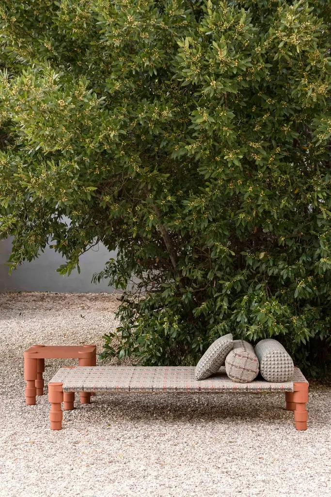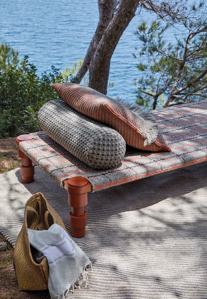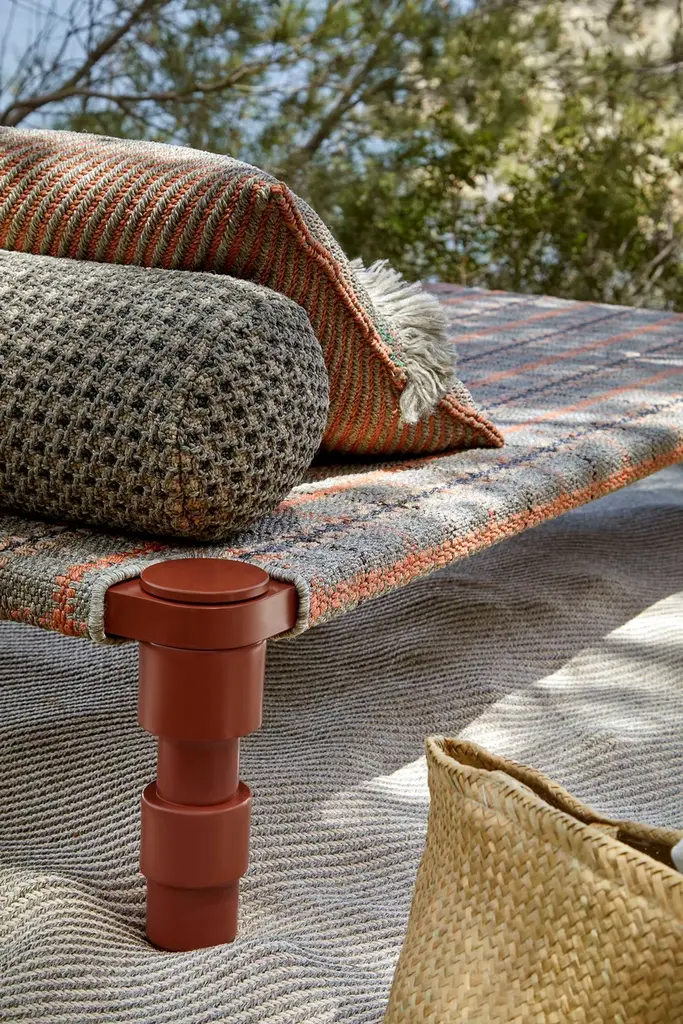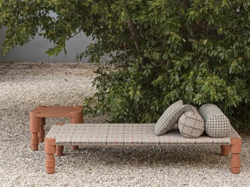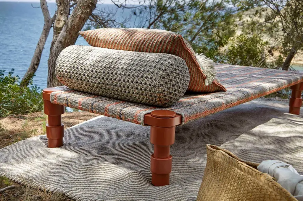 The beds have a powder-coated aluminium frame and are available in three colour combinations: Terracotta frame with Gofre terracotta or Tartan terracotta cover, Grey frame with Gofre blue or Tartan blue cover or Green frame with Gofre green or Tartan green cover.GARDEN LAYERS, GAN’S FIRST OUTDOOR SPACE design by PATRICIA URQUIOLA for GAN.There exist artists who know no boundaries and there are journeys that changeeverything.Patricia Urquiola travelled to India where she was captivated by the delicacy and harmony of the Mongol architecture she found there. Gardens, terraces and miniatures found their way into her restless imagination inspiring a new collection which from the very first spark of creativity she wanted to be for the outdoors.Hand in hand together with her GAN sets its sights on new horizons.GARDEN LAYERS, the first outdoor adventure under the framework of the GAN Spaces series is a collection made up of rugs, mats, roll pillows and cushions that can be arranged in different ways together, with infinite possibilities for outdoor living.The influence of the Orient in GARDEN LAYERS is evident in terms of the way it invites reclined relaxation on rugs and mats, supported on roll pillows and stuffed cushions. It can also be perceived in the fringes, the finishes and the geometry of its motifs.Urquiola once again showcases her masterly design skills. Her creativity in interpretingother worlds and transporting us to them through her exquisite language.The collection is available in three colour groups: terracotta, grey ad blue. Its inspireddesign is combined with high-tech materials and fillings: weather resistant yarns and foams that dry rapidly (dryfast) in order to provide the perfect outdoor behaviour.