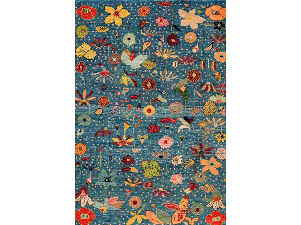 Garden of Eden 18 is a rectangular wool rug with floral pattern.Zollanvari Super Fine Gabbeh.The Garden of Eden is the paradise where Adam and Eve lived, and the word paradise, which has Greek and Persian roots and originally meant a hunting-park or royal garden, is frequently associated with the garden. In Genesis, the garden is described as having temperate weather with no rain, lush flora and gushing rivers. Here's our interpretation of the Garden of Eden or Paradise... lush, vivid, exquisite, flawless, fantastical. How else could have one depicted the 'unknown'? Designing this Gabbeh we hoped to make sense of the saying: 'died and gone to heaven'.