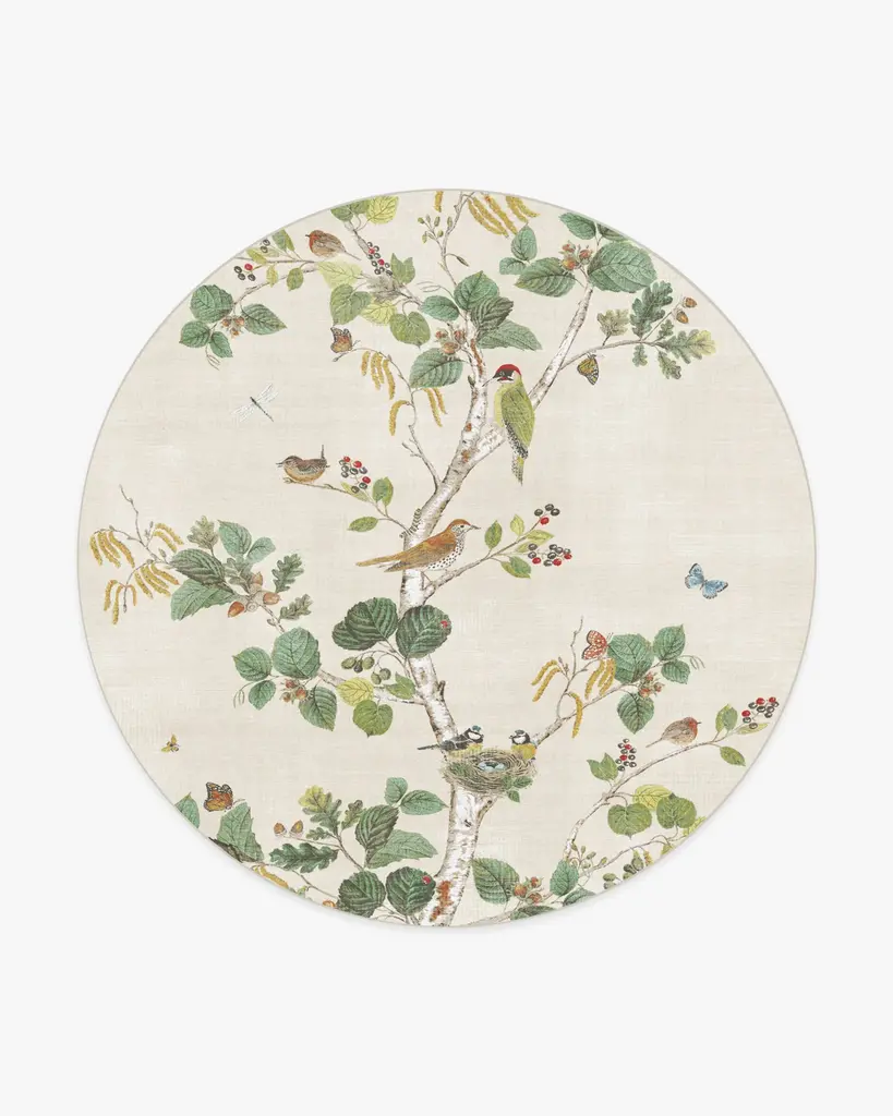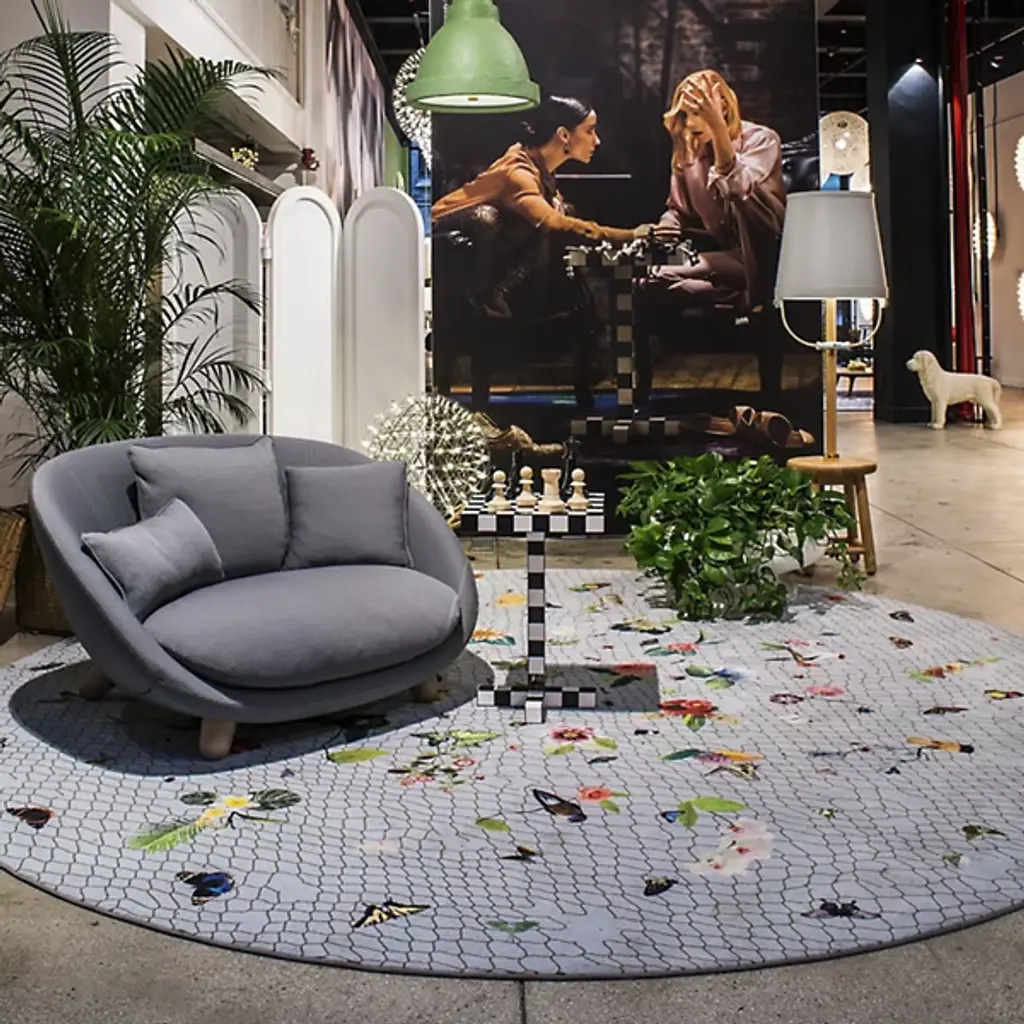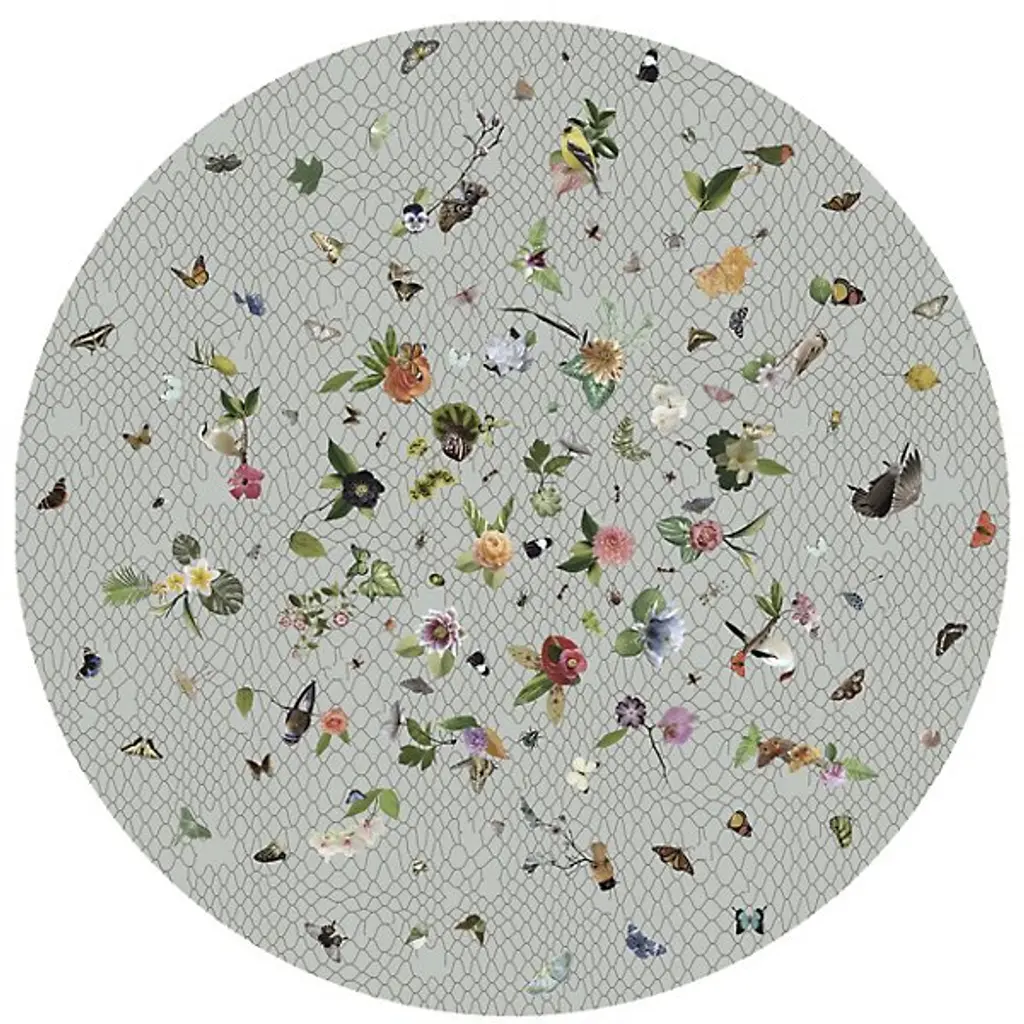 Inspired by the biblical paradise, Moooi's Garden of Eden Round Rug is a contemporary and beautiful take on the Eden setting. Festooned with brightly colored birds and lively-looking plants, the rug's main features are accented by a netted background that prods the back of the mind into a memory of snake skin. This rug is available in two colors and comes in either a durable tufted polyamide or a more luxurious wool blend.