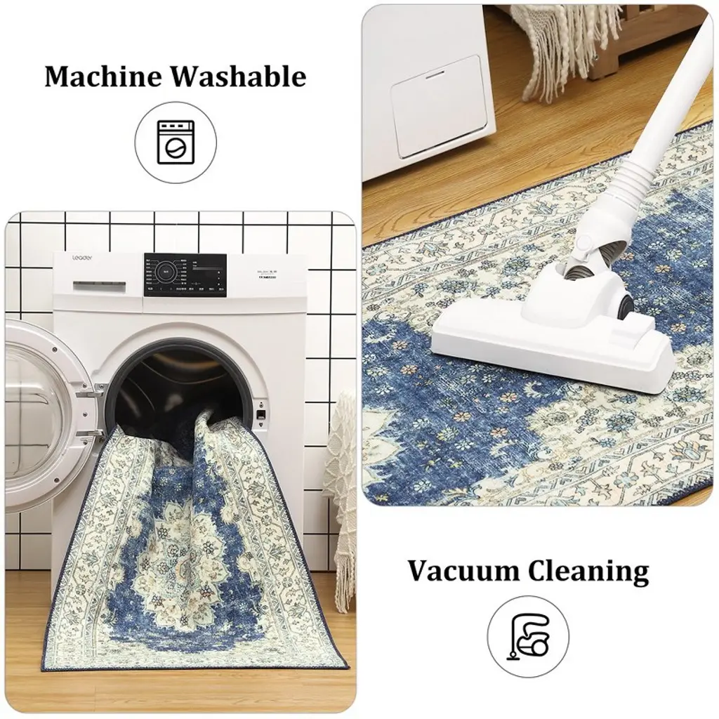 Vintage Area Rugs, Boho Traditional Washable Rug Floral Print Carpet, Low Pile Non-Slip Rubber Backing Foldable Mat for Bedroom Dining Room Office Living Room
