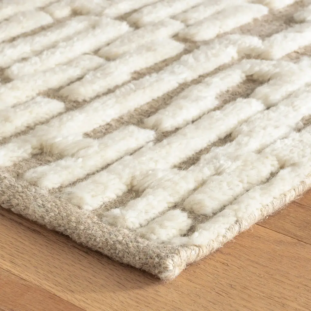 With modern and traditional elements, this sophisticated hand-knotted wool rug demonstrates unique textures inspired by nature. The luxe labyrinth is hand-knotted with lush wool to make a raised grid pattern of plushness, then hand sheared. The resulting subtle variations of pile height are only found in artisanally produced rugs.Offered in a sophisticated palette of mineral-rich neutrals, designed by Marie Flanigan, principal of Marie Flanigan Interiors, reflecting her signature style of timeless elegance and innovative simplicity.