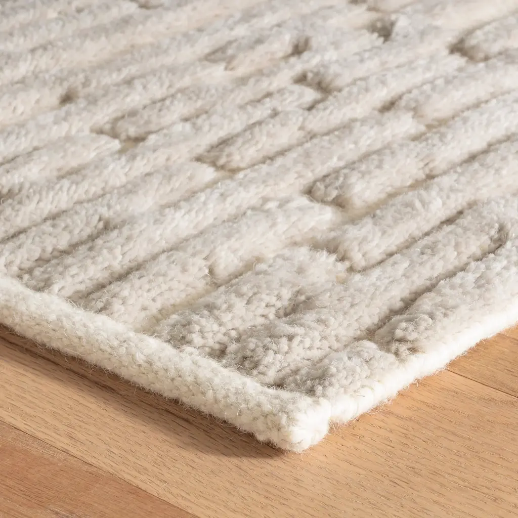 With modern and traditional elements, this sophisticated hand-knotted wool rug demonstrates unique textures inspired by nature. The luxe labyrinth is hand-knotted with lush wool to make a raised grid pattern of plushness, then hand sheared. The resulting subtle variations of pile height are only found in artisanally produced rugs. Offered in a sophisticated palette of mineral-rich neutrals, designed by Marie Flanigan, principal of Marie Flanigan Interiors, reflecting her signature style of timeless elegance and innovative simplicity.