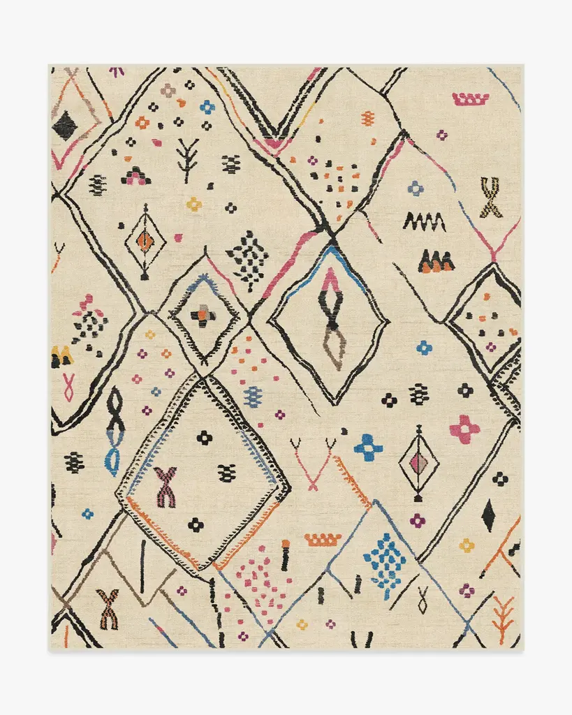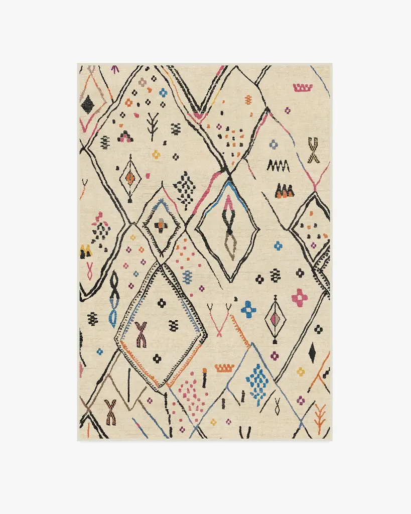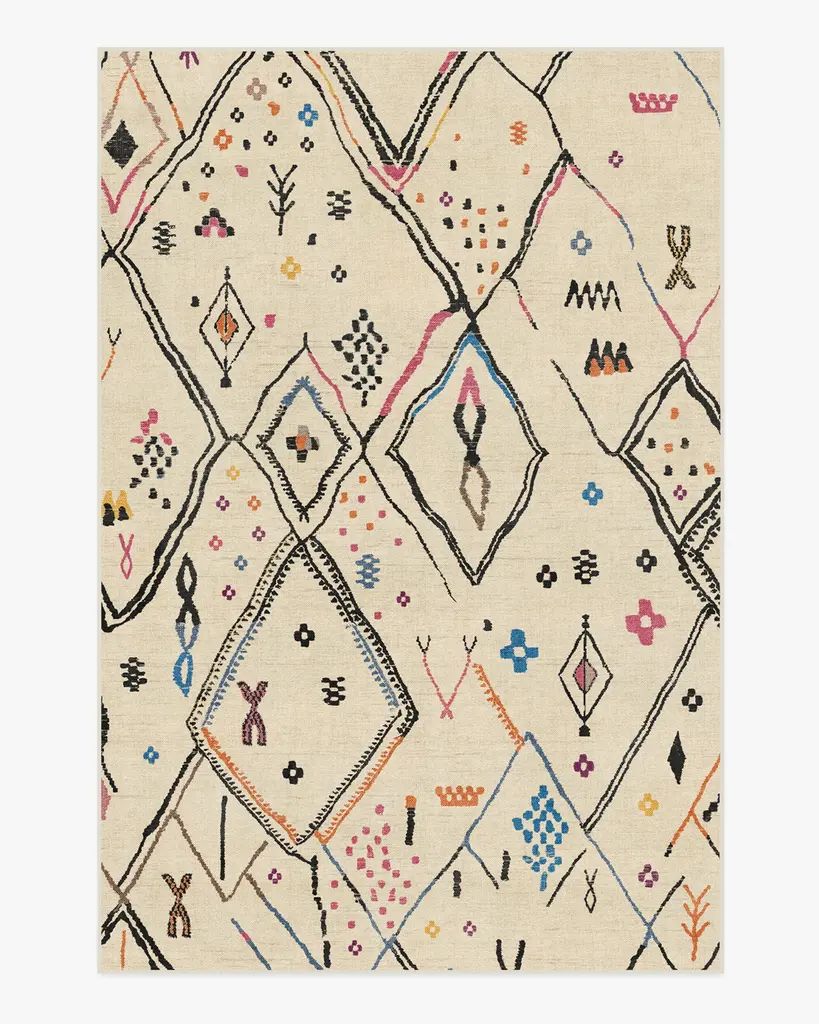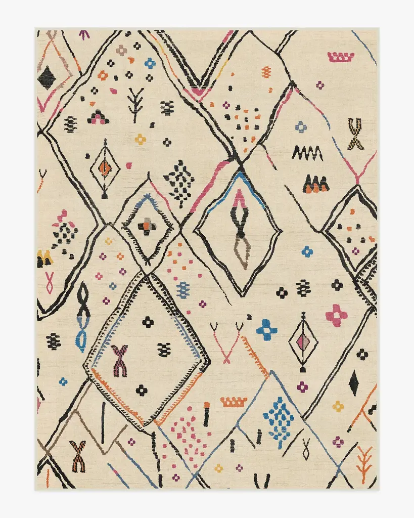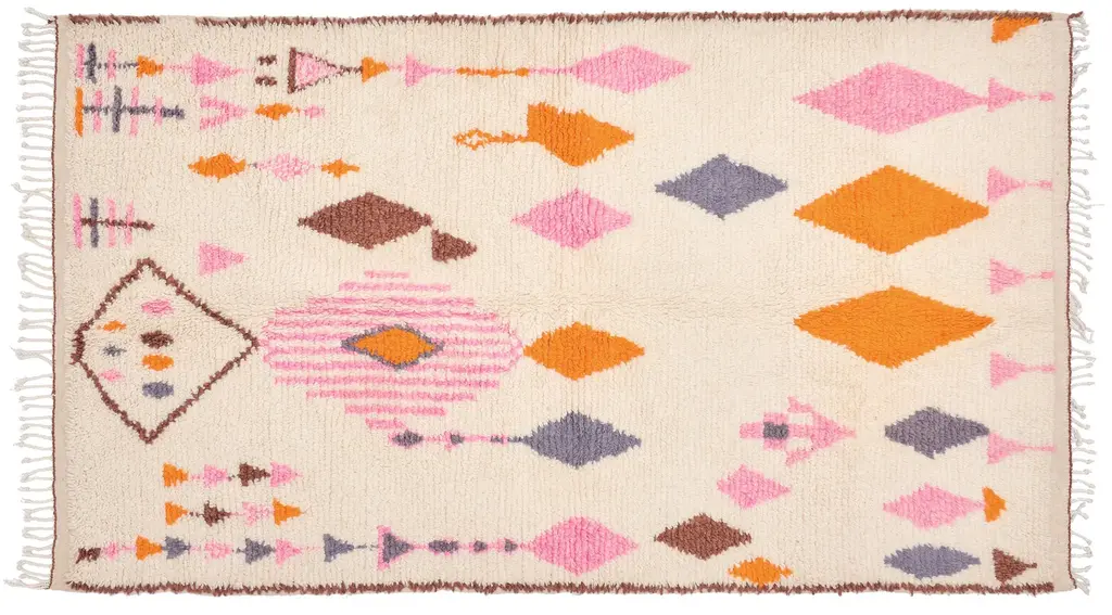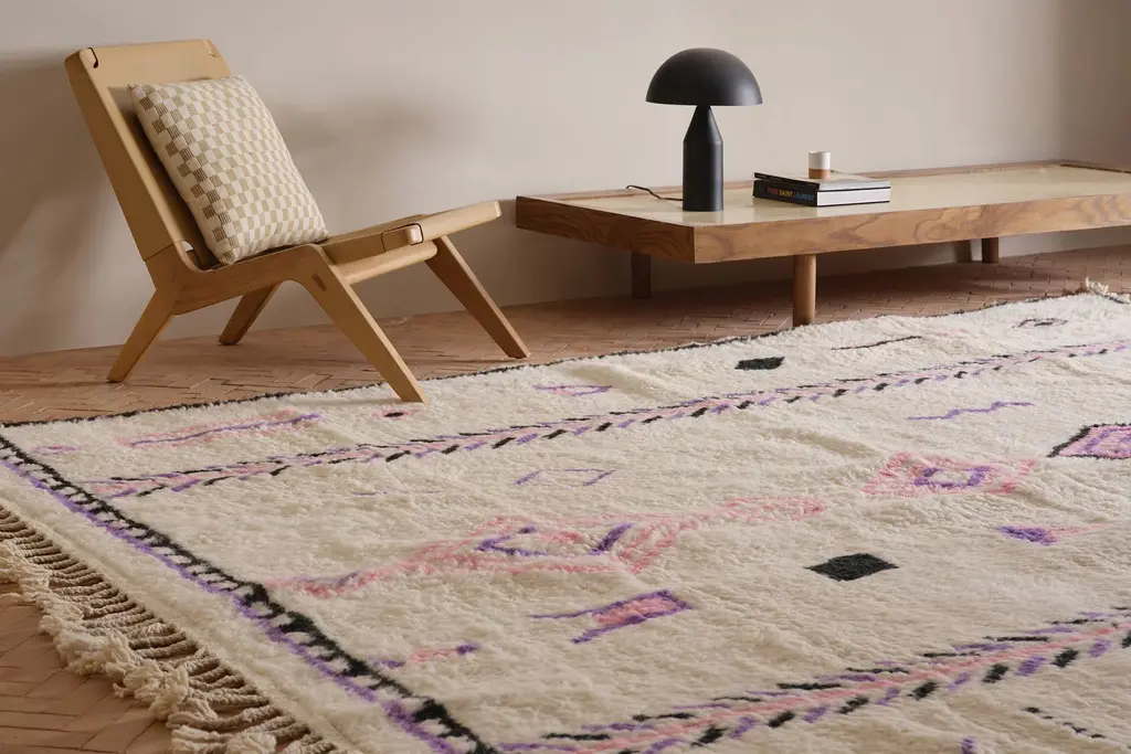 Our Moroccan pieces are each one-of-a-kind. Much of our collection was woven between 30 and 100 years ago, and curated by us. Other rugs in our collection are fresh off the loom and made with traditional techniques. Moroccan rugs don’t come with a key. As with any painting or poem, their motifs have many subjective interpretations. Originally made for personal use, these rugs took months to weave, documenting a shifting tide of events and emotions in the weaver’s life.