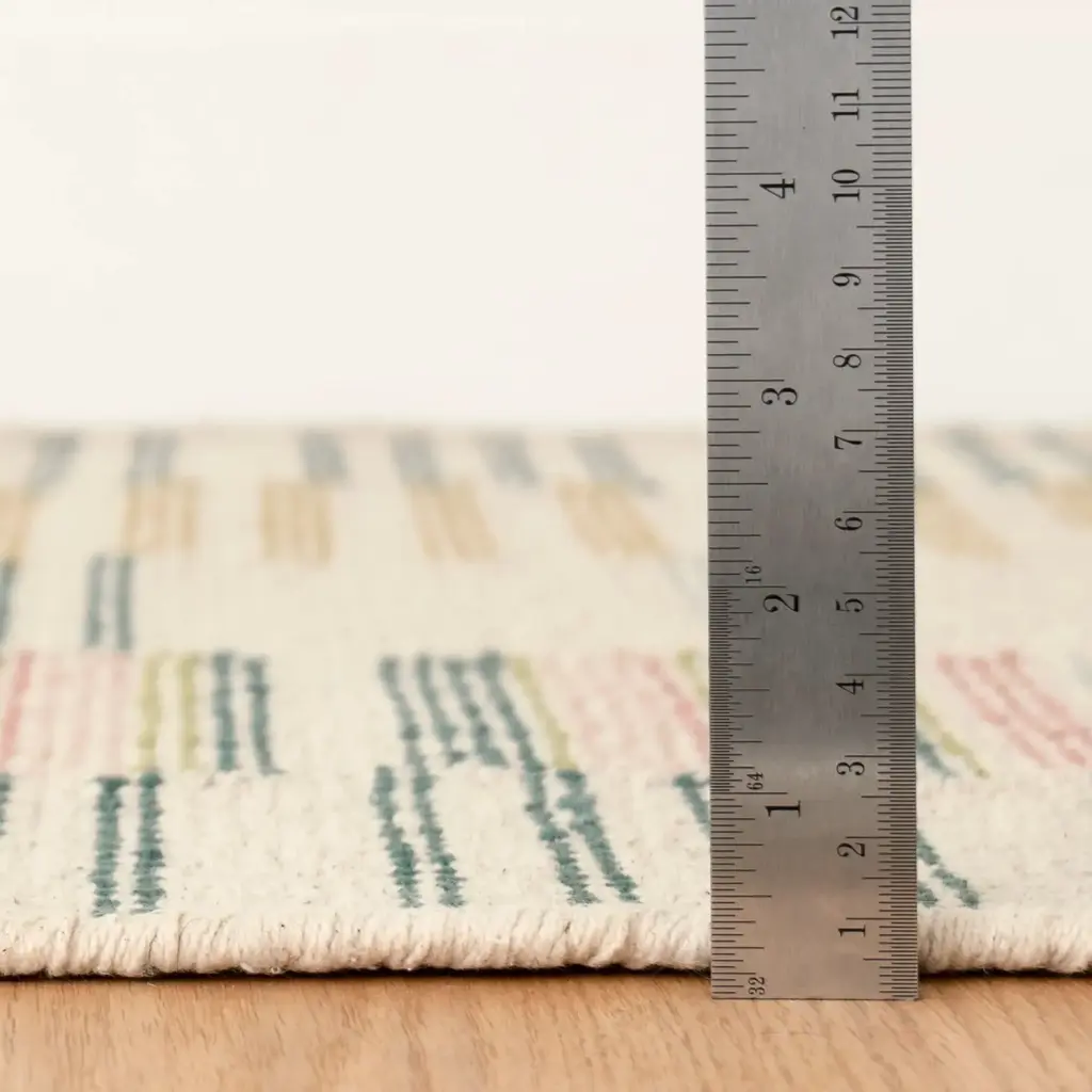 This loom-knotted cotton flatweave features multi-tonal stitches of rose, blue, and citrus on a neutral background, creating a vintage, sun-bleached look. Expertly handwoven, it's soft underfoot and lightweight.