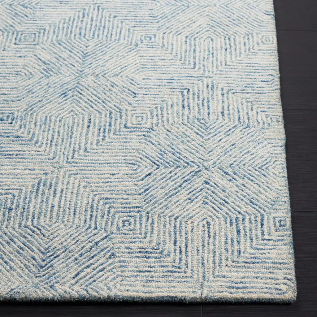 Elevate your space with the sophistication of this 5' X 8' medium rectangle area rug, showcasing a harmonious blend of blue and ivory hues. Constructed using the hand-tufted method, this rug boasts a pile height of 1/4", providing a plush feel underfoot. The meticulously crafted 80% wool and 20% cotton composition ensures lasting durability and a touch of luxury. Originating from the skilled artisans of India, each rug radiates a timeless charm that complements any decor style. Featuring a captivating geometric pattern, this rug brings an eye-catching focal point to your room, seamlessly integrating with both modern and traditional settings. While the rug is not washable, proper care and spot cleaning can preserve its allure. Please note that a non-slip pad is recommended as this exquisite piece is not slip-resistant. Imbue your home with this beautiful, culturally-rich centerpiece that promises to be a conversation starter in any living space.