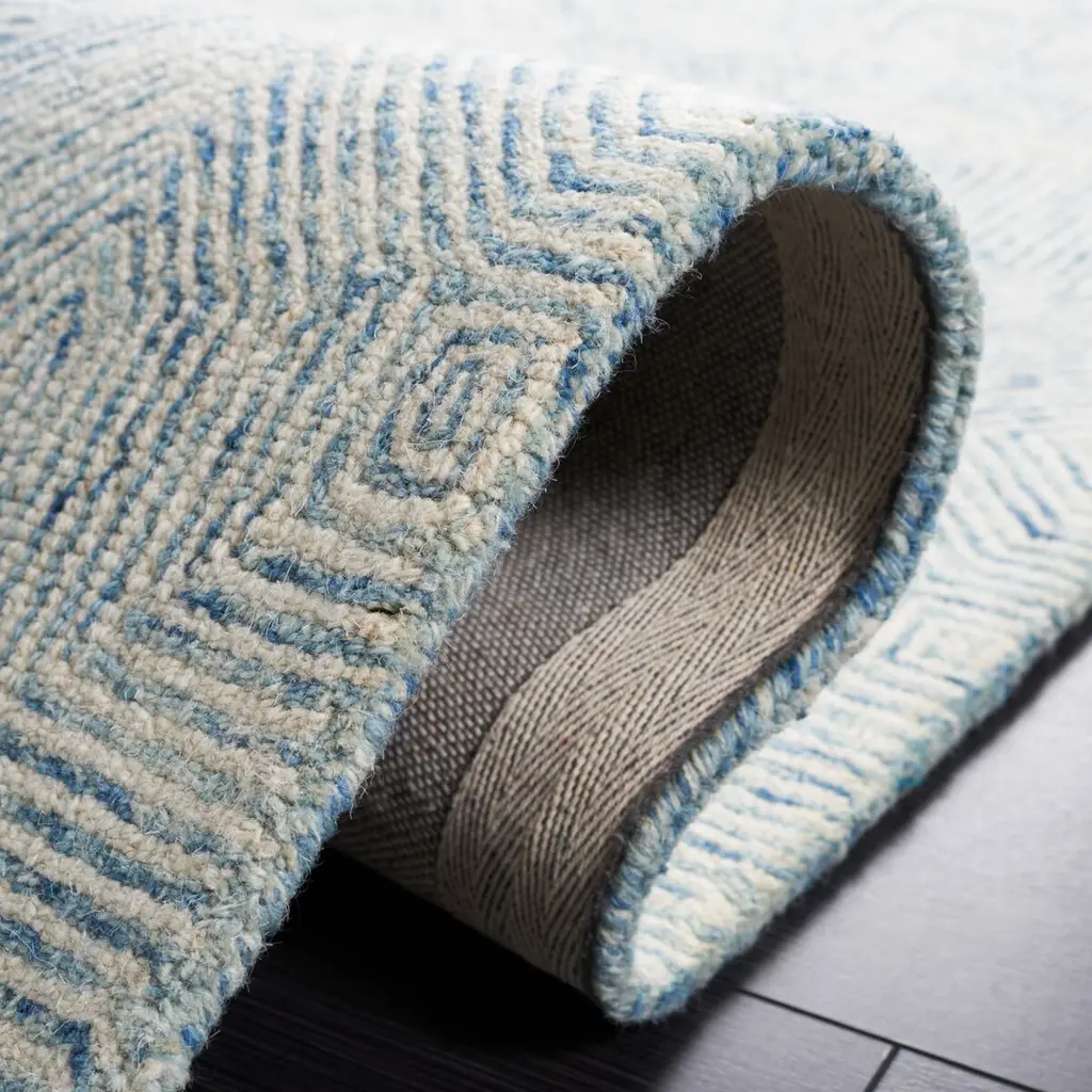 Elevate your space with the sophistication of this 5' X 8' medium rectangle area rug, showcasing a harmonious blend of blue and ivory hues. Constructed using the hand-tufted method, this rug boasts a pile height of 1/4", providing a plush feel underfoot. The meticulously crafted 80% wool and 20% cotton composition ensures lasting durability and a touch of luxury. Originating from the skilled artisans of India, each rug radiates a timeless charm that complements any decor style. Featuring a captivating geometric pattern, this rug brings an eye-catching focal point to your room, seamlessly integrating with both modern and traditional settings. While the rug is not washable, proper care and spot cleaning can preserve its allure. Please note that a non-slip pad is recommended as this exquisite piece is not slip-resistant. Imbue your home with this beautiful, culturally-rich centerpiece that promises to be a conversation starter in any living space.