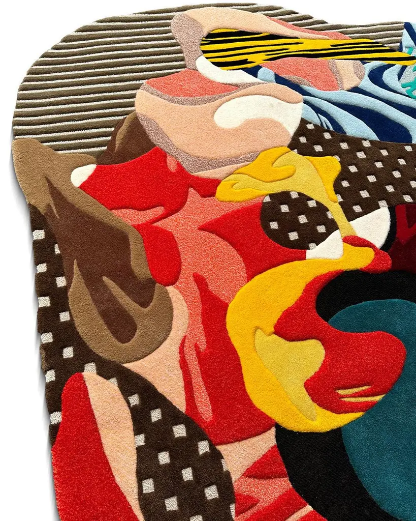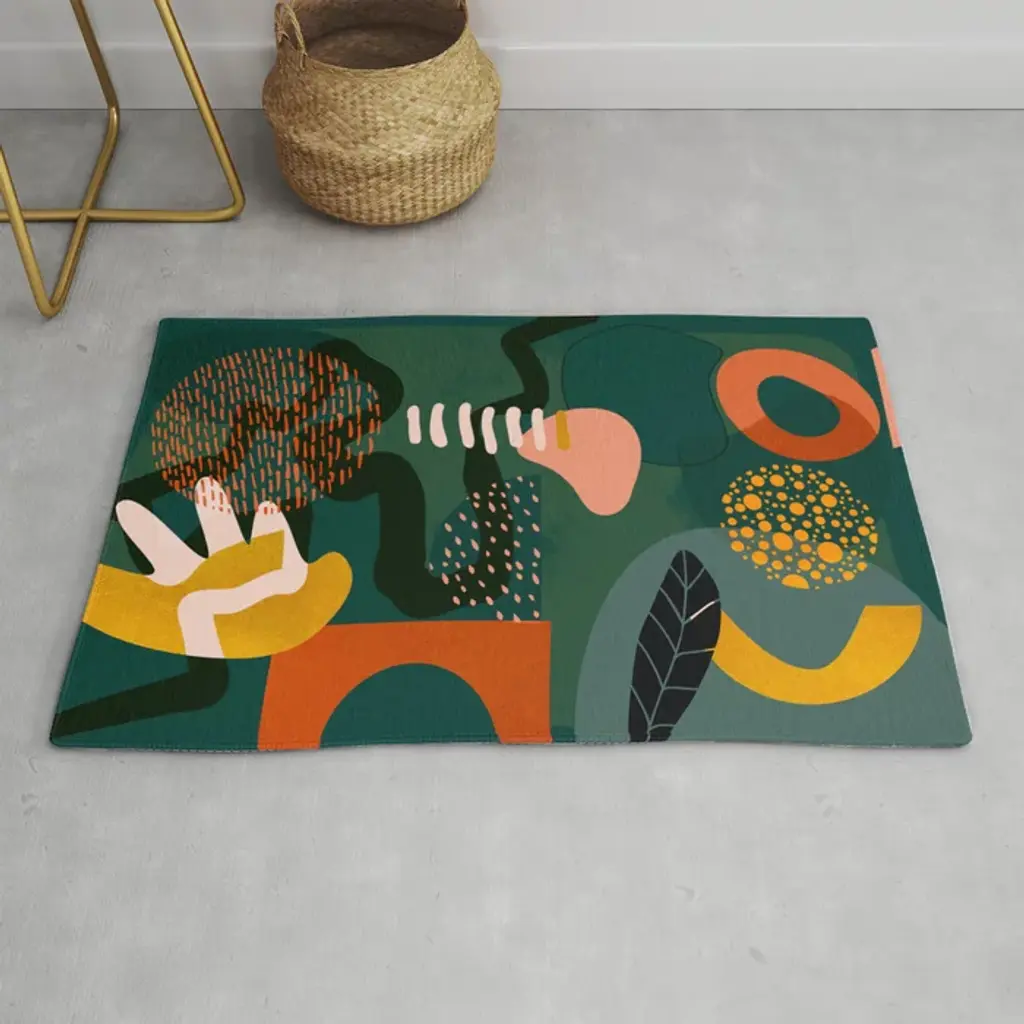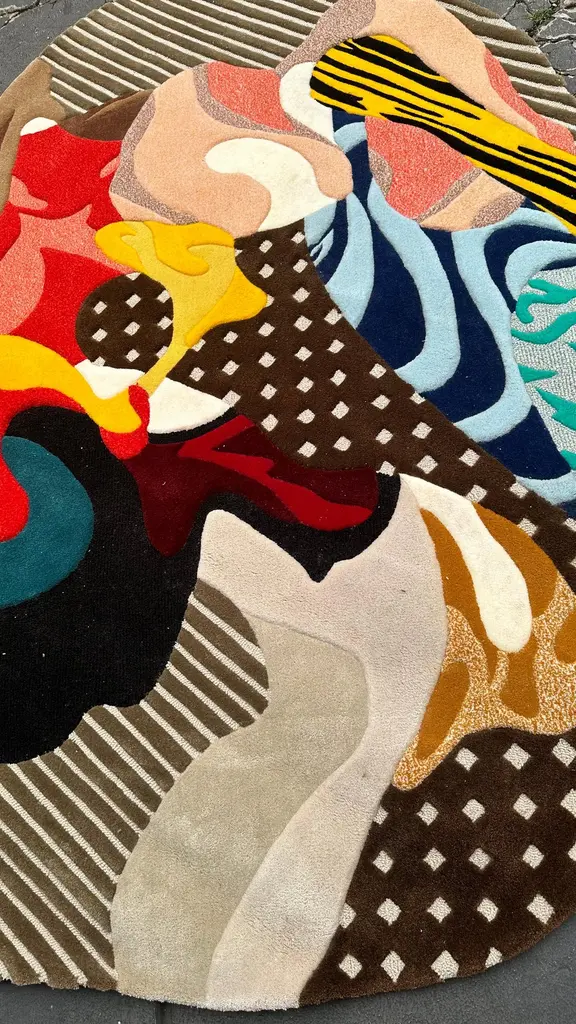 A personalized, spunky, and eclectic rug, resembling a collage of every decorative item in the room, exhibits an abstract pattern infused with geometric elements.The organic, circular shape takes into consideration the preexisting chair placement, resulting in a vibrant interplay of contrasting styles. With its diverse mix of patterns and colors, this dynamic rug stands out as a truly unique statement for your space.Custom size and color available