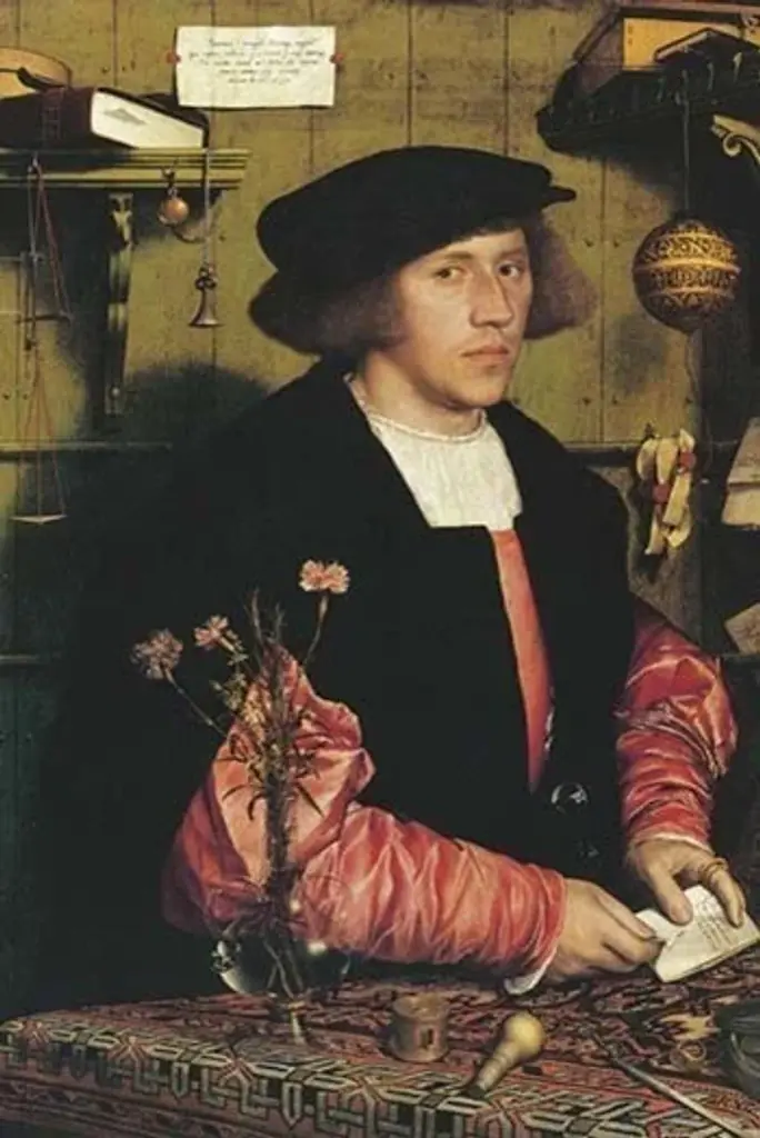 George Gisze - A merchant; It is the most sumptuous of his series of portraits of mainly German merchants of the Steelyard, a complex of offices, warehouses, and residences on the north bank of the Thames in London. Familiar with Holbein's wider reputation, the merchants were quick to take advantage of his presence in London. The Danzig merchant Georg Gisze (or Giese) is shown among the paraphernalia of his trade: money, pen, seal, inkpots, balance, boxes, scissors, keys. on a table covered with a Turkey rug stands a vase of carnations, perhaps symbolizing his betrothal (Gisze married Christine Kreger in Danzig in 1535).