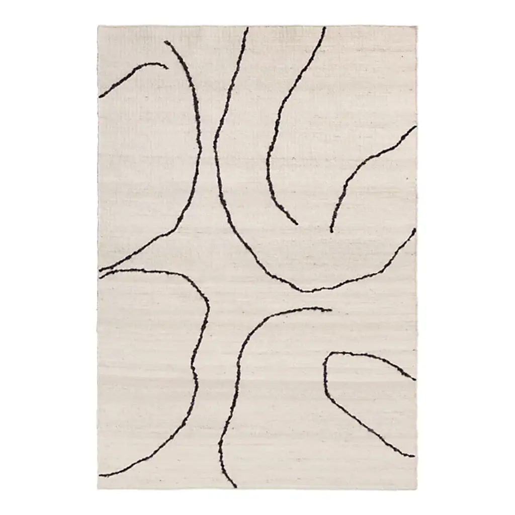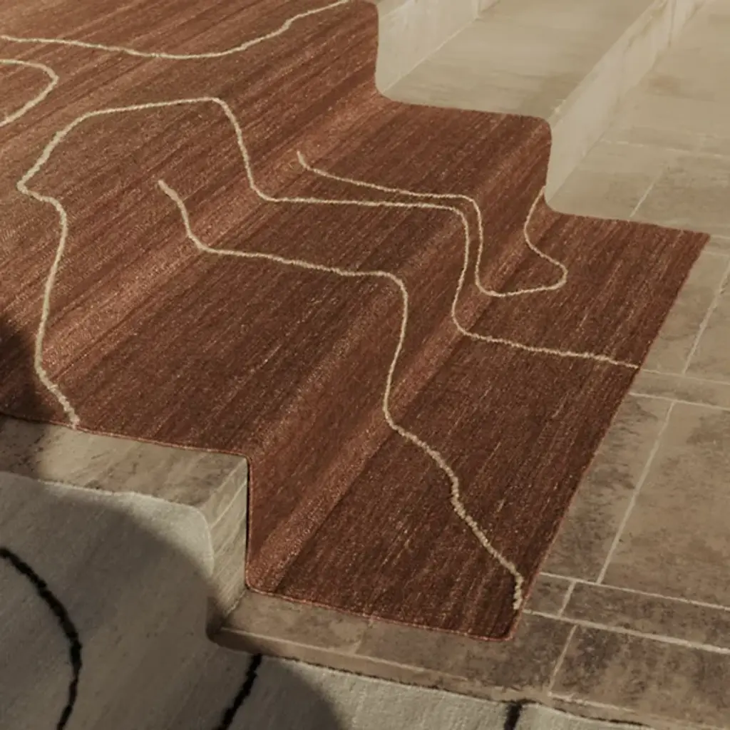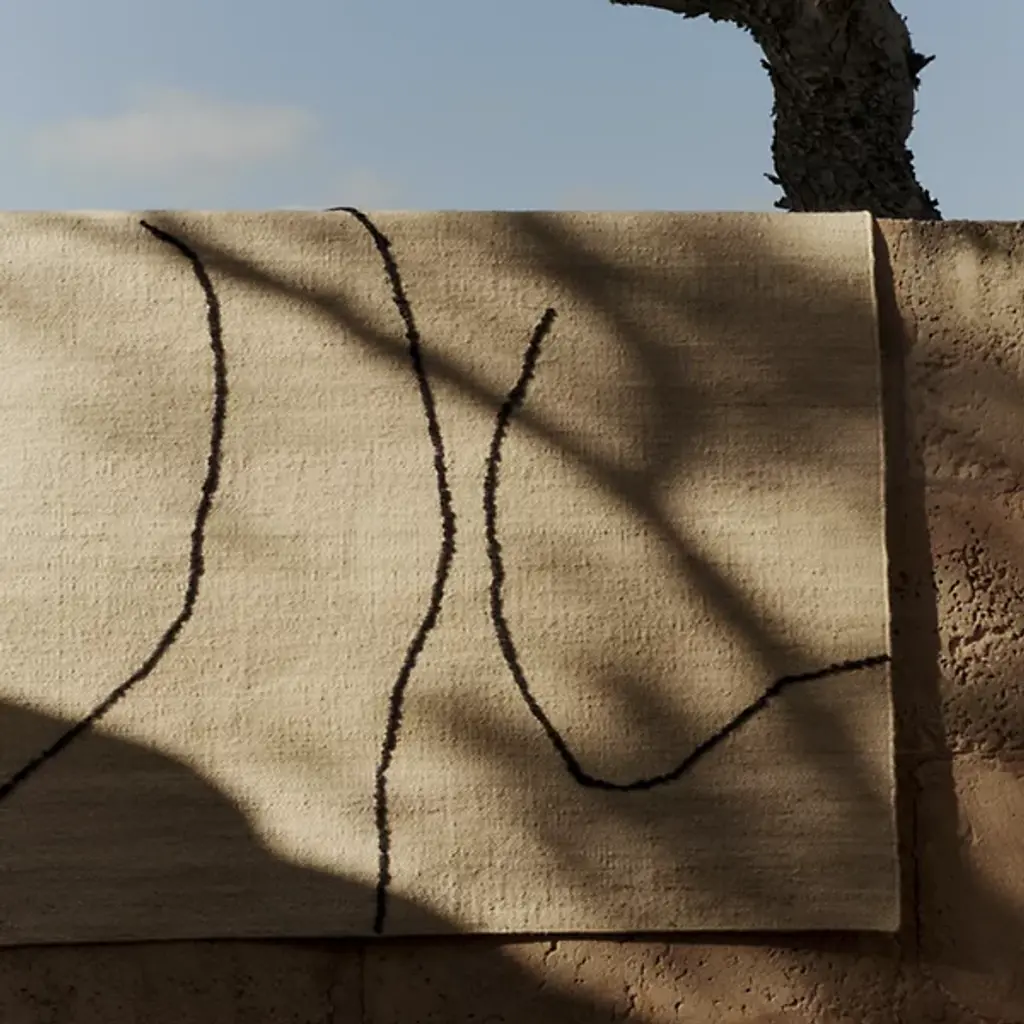 The Gesso Jute Rug from Ferm LIVING showcases hand-spun jute fibers woven into an organic base that supports raised woolen lines flowing across the surface. These textured elements create pathways of softness against the rougher jute background, adding tactile contrast underfoot. The abstract pattern emerges through the interplay between materials rather than applied color, letting natural fiber tones dominate the overall appearance. This handwoven construction means each rug develops its own character through slight variations in tension and texture, creating a floor covering that feels personal and artisanal.