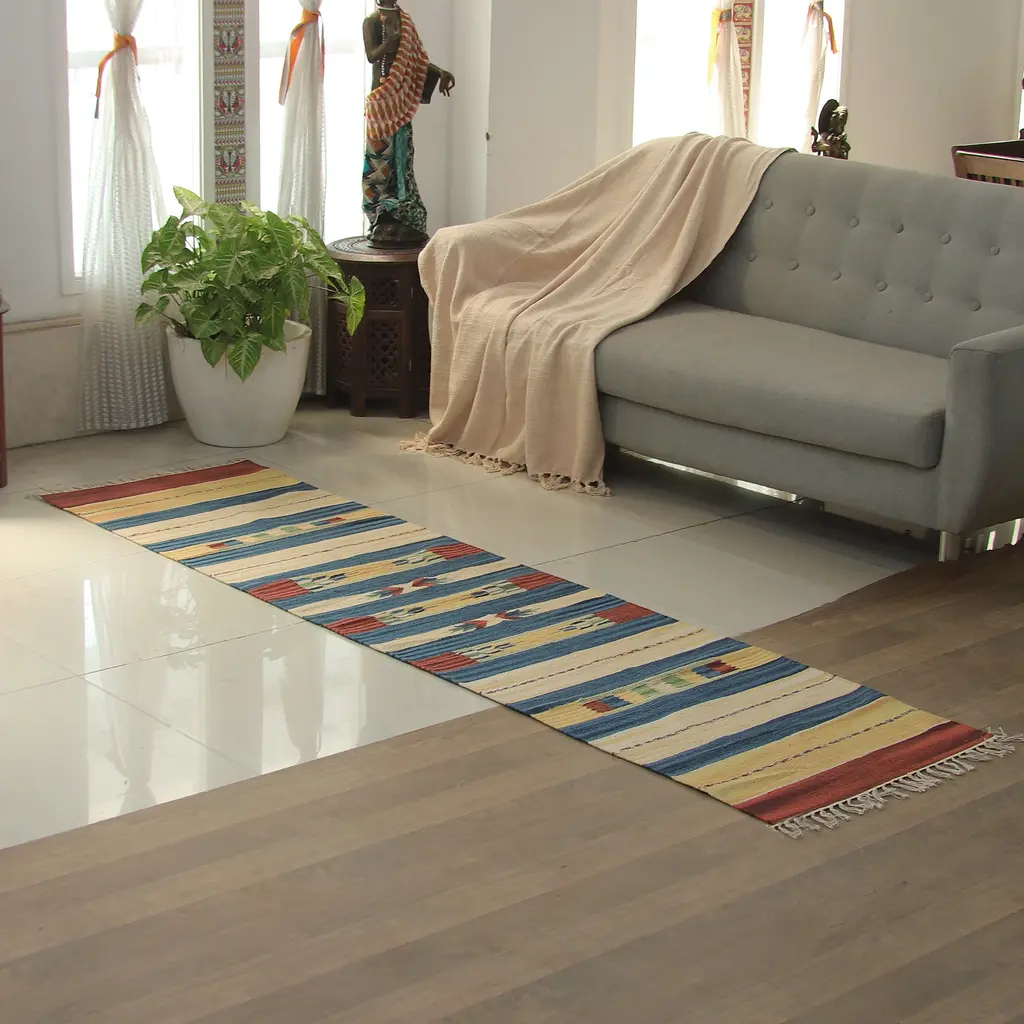 Ghashgha’i Jajim is a rectangular wool rug.Our highly popular jajims are woven exclusively for us by the tribes of the southwestern region of Iran. They are colourful flatweaves (sometimes in mixed techniques), with and without decorative overlaid-embroidery and sewn-on pom poms. The designs are mainly geometric and typical of the aesthetics of the nomadic tribes that weave them, yet they have a thoroughly contemporary feel. This makes them ideal decorative complements for any interior when used as throws and covers. The tribal flatweaves or kilims (known as gelims in Farsi) are traditional colourful weavings with bold geometric and floral designs. They are woven by Luri and Ghashgha’i nomads who interpret centuries’ old designs and motifs that have been handed down from generation to generation.