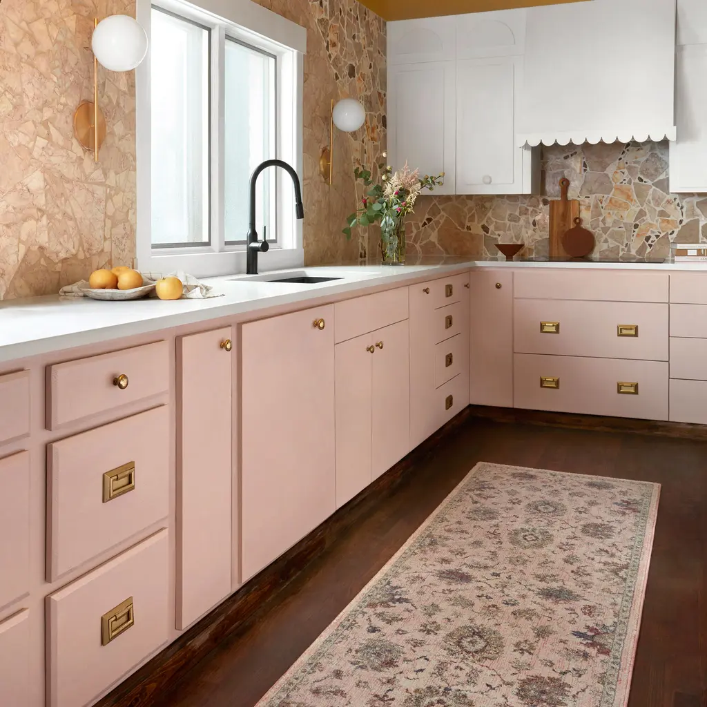 Featuring gently distressed floral motifs against a blush-hued ground, the Giada rug combines a luxurious vintage-style design with a durable construction. This innovative area rug reimagines ornate botanical emblems in a cheerful, neutral-friendly palette to enliven modern and contemporary settings. Available in sizes for every space with a soft pile that will not shed, Giada is ideal for high-traffic areas in homes with children and pets.