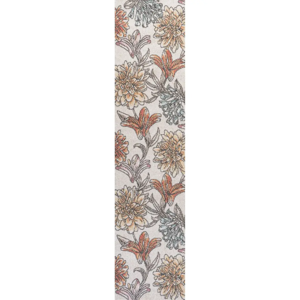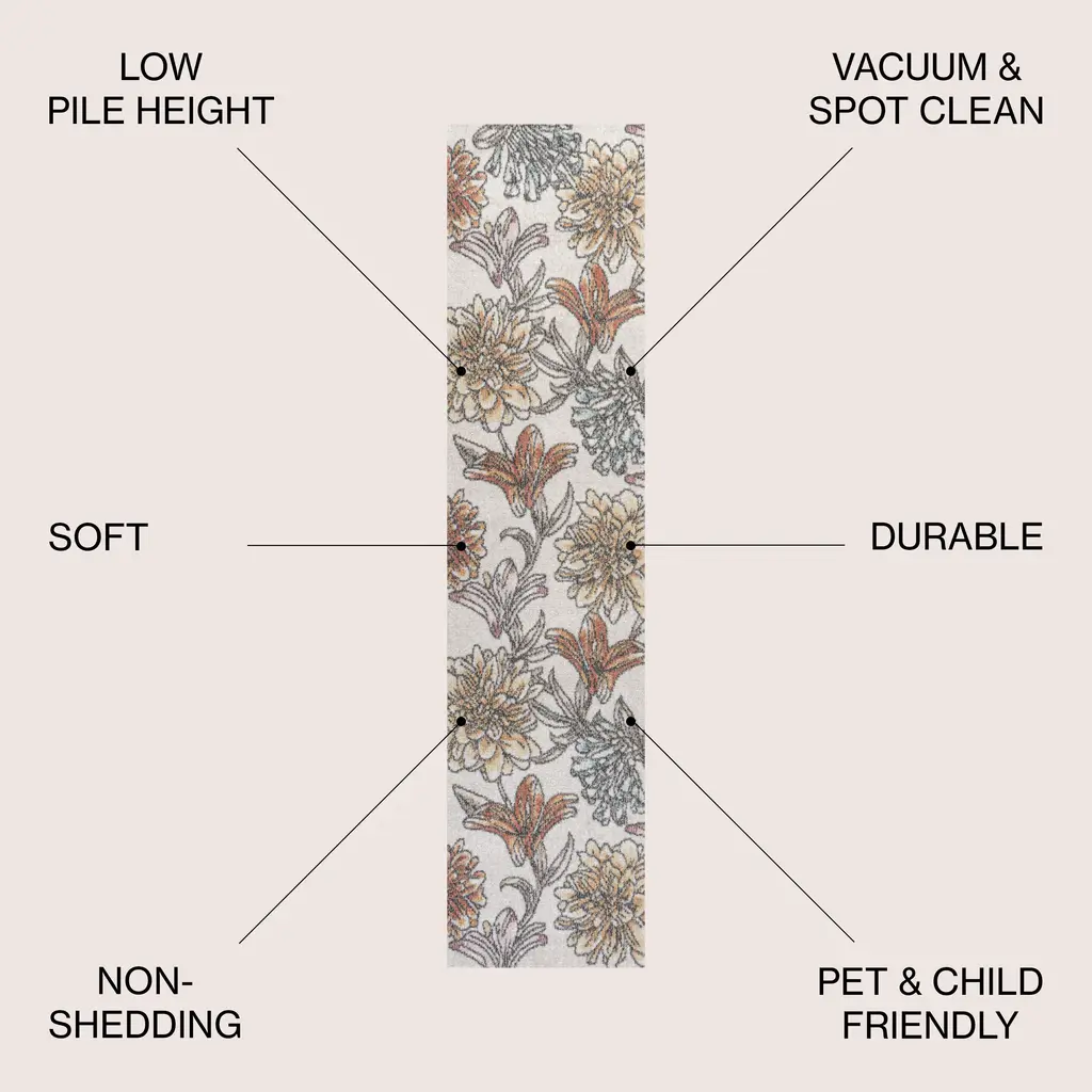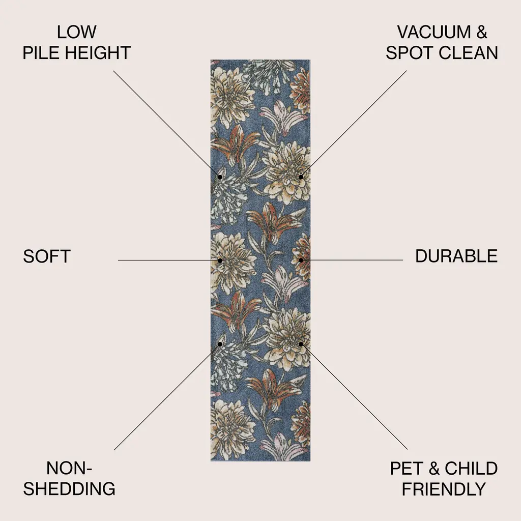 Layer on the Boho cottage style with this lively rug's all-over floral design. The graphic pattern gives vintage botanical prints a modern vibe. Easy-care low pile and a busy design make this pet-friendly rug perfect for a bedroom, living room, kitchen, or dining area.