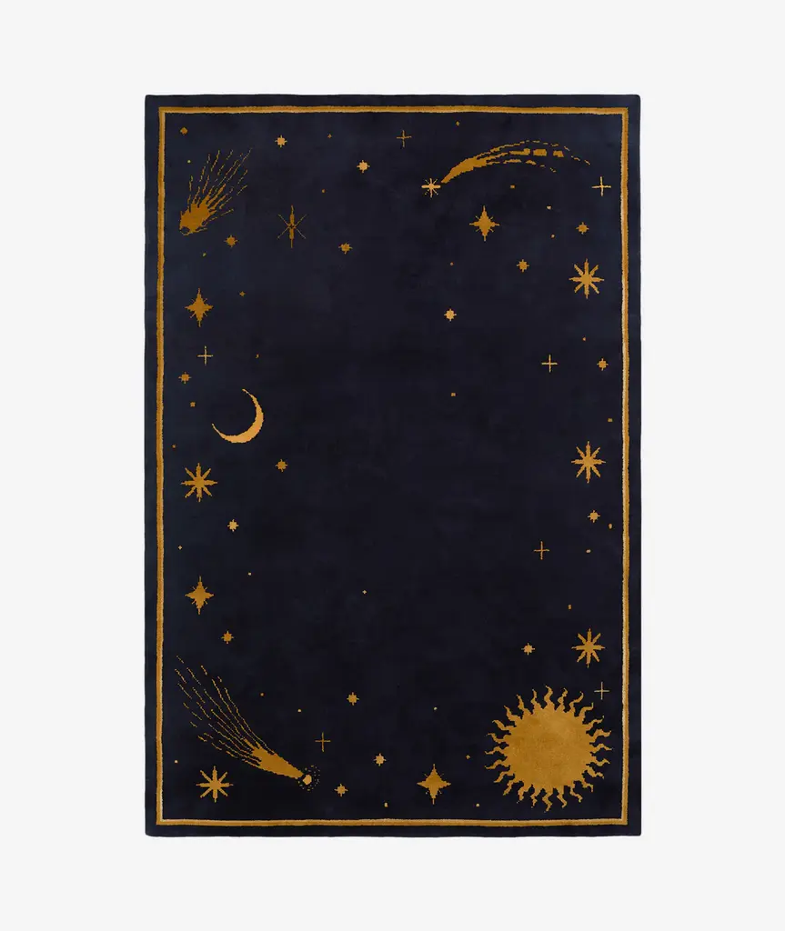 Bring stellar vibes to your space with this geometric rug featuring an astrology-inspired pattern. Crafted from durable polypropylene with a stain-resistant finish, it's a celestial addition to any room. This rug is designed for residential use, making it an ideal choice for star-gazers and style enthusiasts alike.