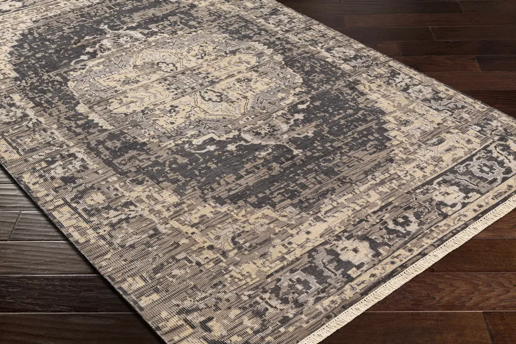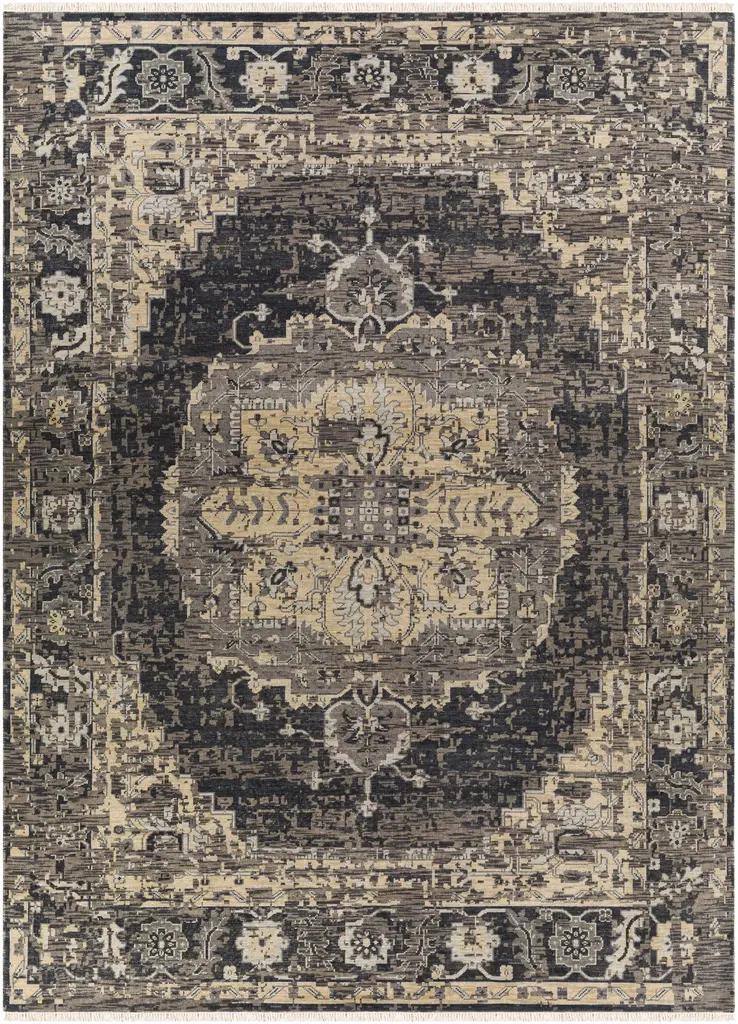 Collection: Girraween Colors: Black, Charcoal, Cream, Taupe, Gray Construction: Hand Knotted Material: 100% NZ Wool Pile: Low Pile Pile Height: 0.06" Styles: Traditional Made In: India Thickness: 0.2" Fringe Length: 1" Price Range: $$$$$ (Premium)