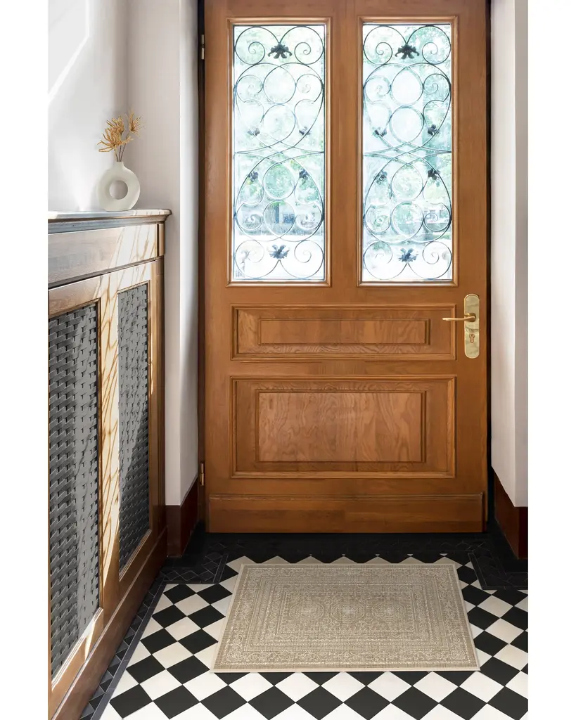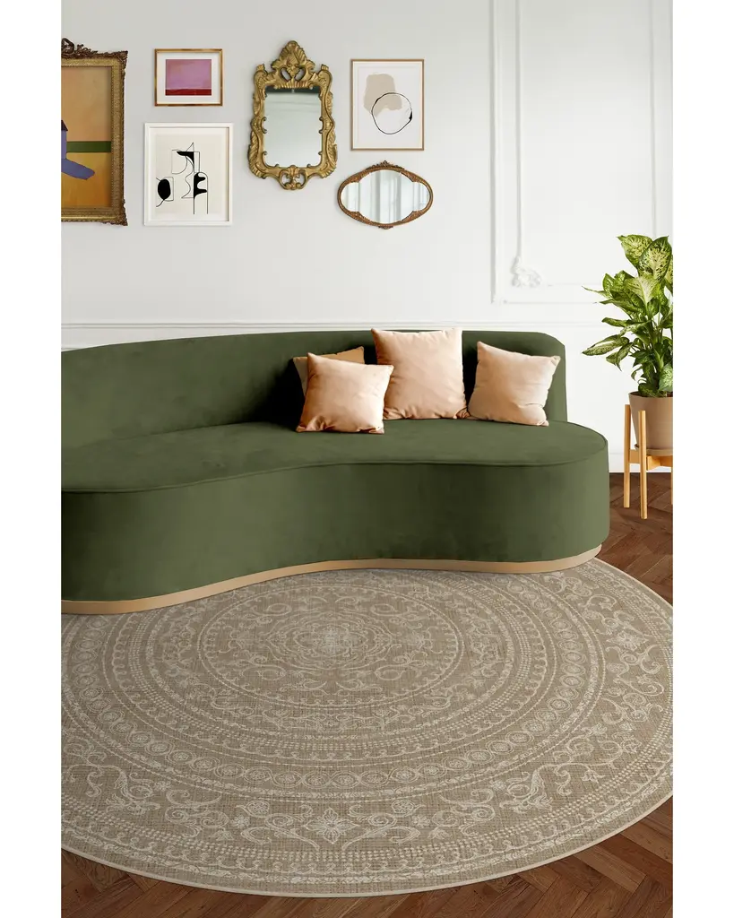 Understated elegance. Our Gisele Natural Rug boasts an intricate floral and geometric border pattern surrounding center medallions in white set atop a beige background. Water-resistant, stain-resistant, and machine-washable.